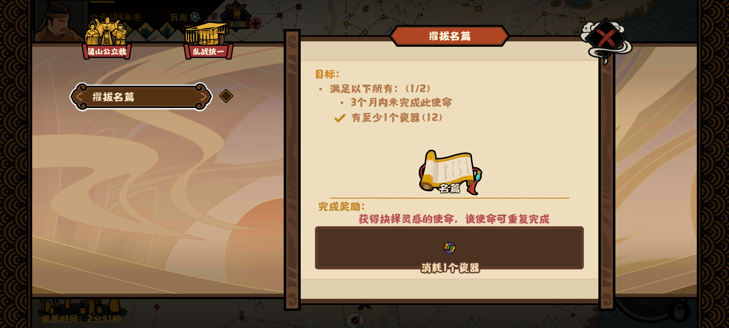 核心名臣甘兴霸,其余随意。君主:我带了谢道韫科技+2,天策上将李世民,西楚霸王项羽,开元通宝金钱产量提升,有没有也无所谓多在要地造铁,很多军规、战力政策需要开局直接发兵王朗才想起点政策过程:劫掠王朗,迁都刘繇,劫掠豫章(不给其他势力发展机会),劫掠孙策,迁都寿春,劫掠汝南,迁都下邳,迁都小沛,迁都鄄城,劫掠濮阳,劫掠宛城,迁都孔融,迁都南皮,公孙瓒两个治所任选其中一个迁都、另一