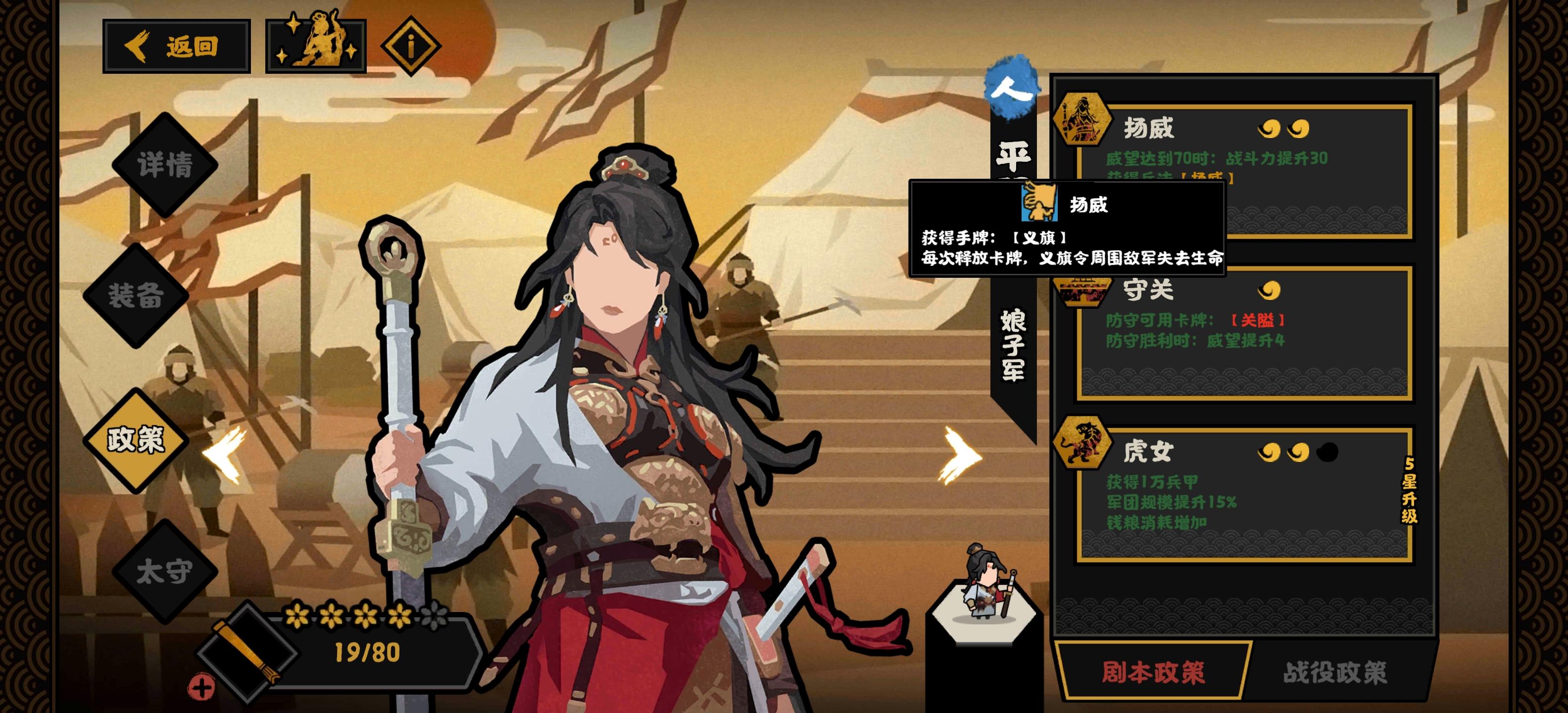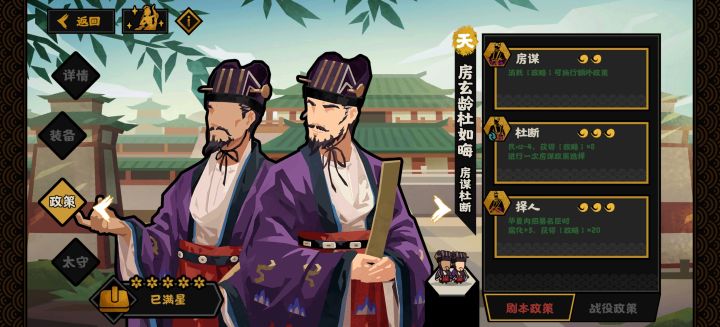 从上到下房谋*5随机牌1级*4随机牌2级*3随机牌3级*2杜断房谋:一队友军攻击格挡+15%受范围伤害+15%随机牌:荐才1级:选中友军恢复50生命,后续受范围伤害-20%,不可叠加2:75生命 范伤-25% 不可叠加3:100生命 范伤-30% 不可叠加吏治1级:令1队友军格挡提升15%最近的初始敌军眩晕10秒2:格挡20% 眩晕15秒3:格挡25% 眩晕20秒运筹1