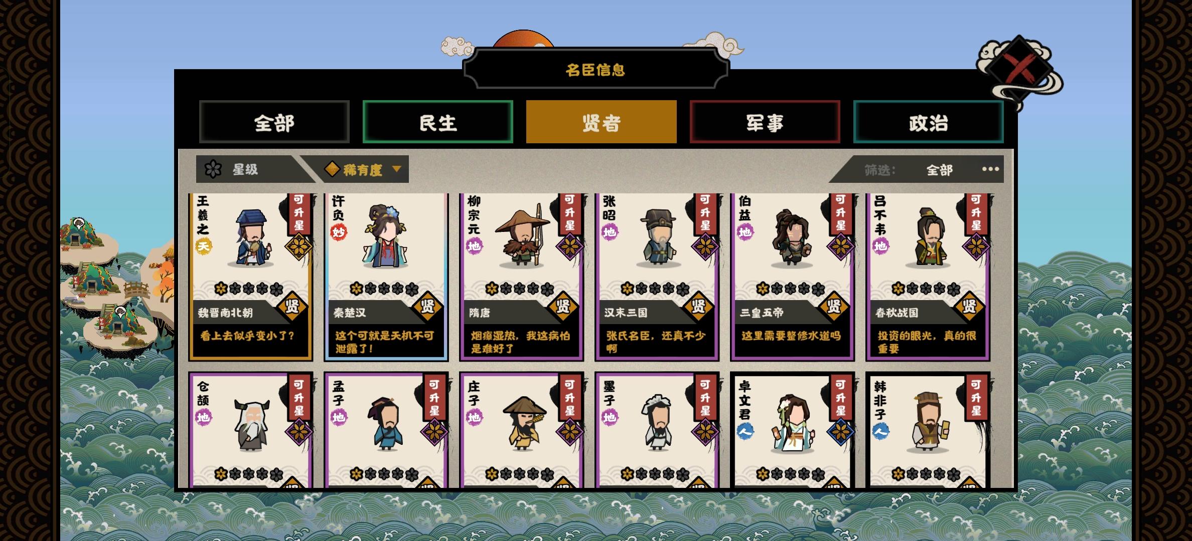 刚拿了个许慎,凑了个还能看的,也就是出了房杜,有6个字,貌似有点搞头。2+4+4+6=16,16×8-50=78;16×10-50=110;16×12-50=142; 如果在剧本里招募的都是两个字的,只有6个字,如果都是三个字,就有9个字,所以是在9~6个字之间,最理想状况下,是能满25个字的。25×12-50=250;22×12-50=214。虽然满级拥有两个祖冲之还多10点的战力