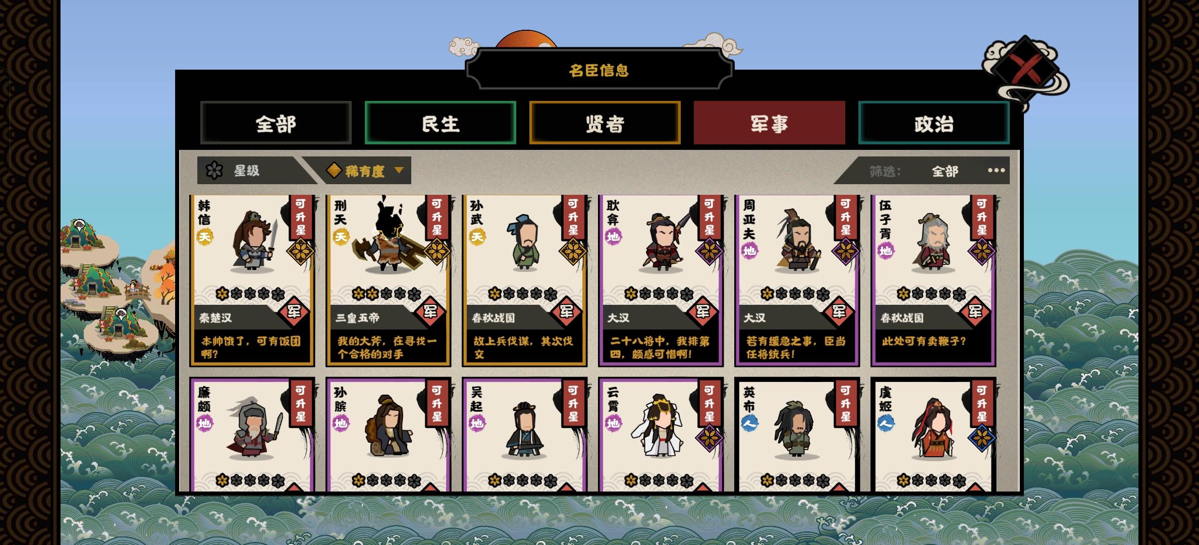 从上到下房谋*5随机牌1级*4随机牌2级*3随机牌3级*2杜断房谋:一队友军攻击格挡+15%受范围伤害+15%随机牌:荐才1级:选中友军恢复50生命,后续受范围伤害-20%,不可叠加2:75生命 范伤-25% 不可叠加3:100生命 范伤-30% 不可叠加吏治1级:令1队友军格挡提升15%最近的初始敌军眩晕10秒2:格挡20% 眩晕15秒3:格挡25% 眩晕20秒运筹1