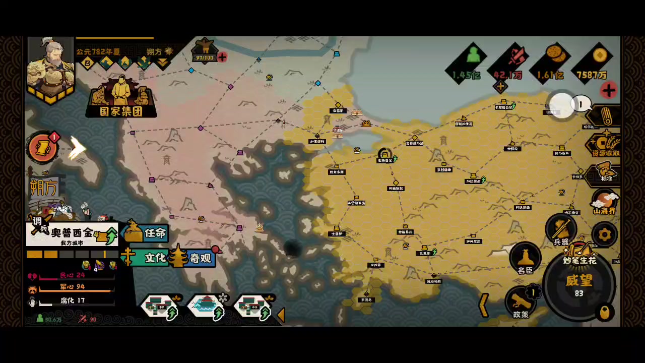 写在前面:各位王上好,我是子在川上曰。今天带来的是安史之乱剧本李隆基的开荒指南,希望能够帮助各位王上轻松获得全部结局。 一、剧本新玩法与目标讲解本次剧本沿用并丰富了大唐主剧本的国家集团玩法,接下来我会简单介绍一下本次新增玩法,详细讲解则会在开荒指南中进行。在国家信息中,新增了行政压力这一属性,行政压力主要起到制约作用,随着领土面积的扩大与不同文化势力的增多,行政压力也会随之上升,进而带来额