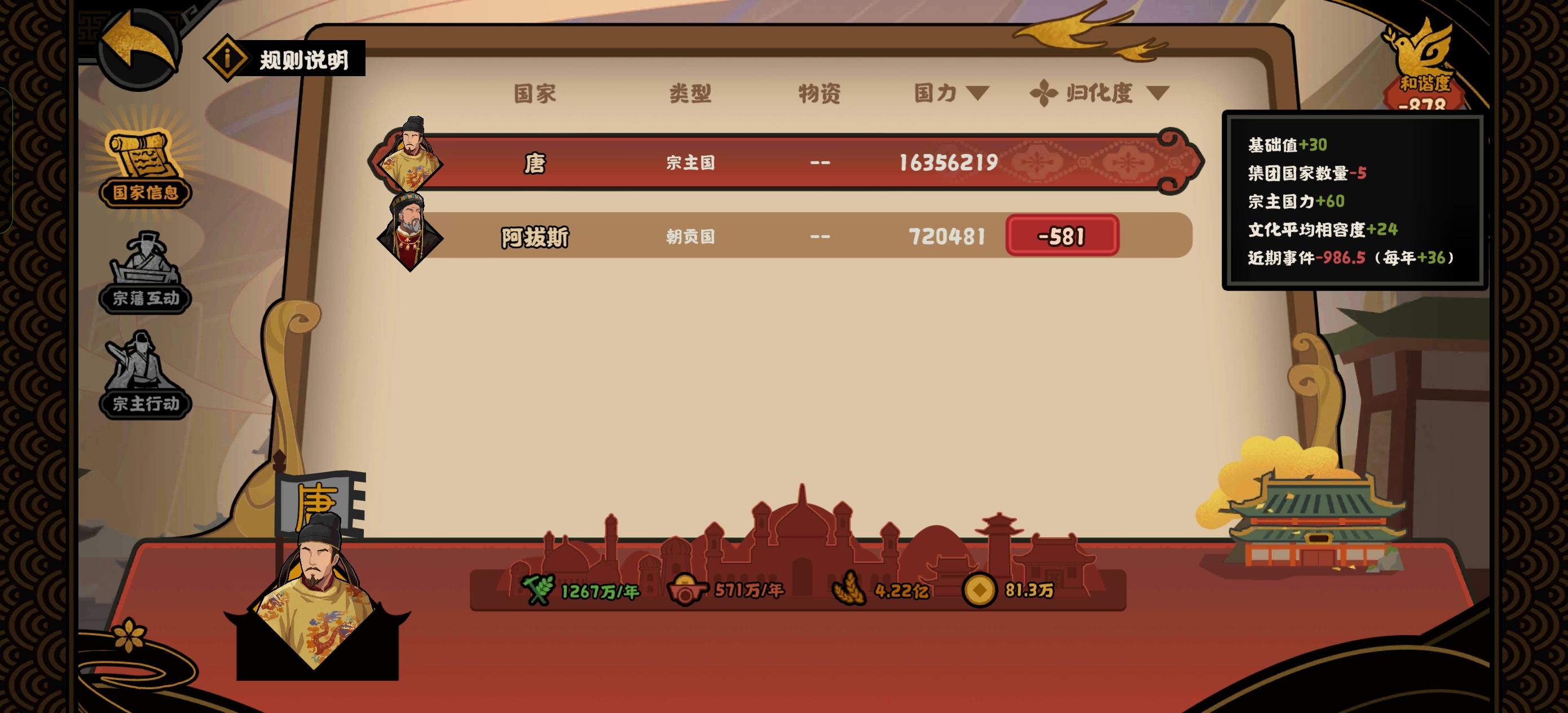 底层逻辑:康养林拆了重建无限拿威望>科举拿行动力囤囤囤>无限加速宣扬国威(把和谐度堆破千)>把阿拔斯等远国纳为朝贡国>。。。(吞并流程>吞并(最好是升为了都护府)注意事项1️⃣:对别的宗主国,要先离间他们的国家集团,最好搞叛乱,把各国拆成独立的就行,然后才能纳为朝贡国(痛苦一天了还没搞完,小国的话还是自己打把)注意事项2️⃣:不停写诗,转变文化,可以降低行政压力