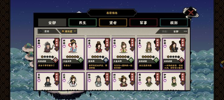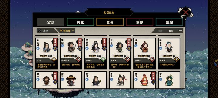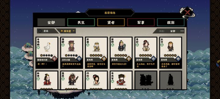 新人练度不明,核心名臣不多,无金武打起来绝对吃力,不信我和你赌。而且安史事件太随机,等个名臣事件等老半天,稳定点的就王维,李白。之后就是地图上的薛涛,裴行俭这些三国,魏晋,唐这些剧本正式进入战力膨胀期,战力单位从十到百,新人名臣不强打起来就是吃力,我建议是从三国开始打一些史实模式比你干安史强。安史机制太多了,你也不知道新人对游戏理解什么程度,可能连要地治所机制没弄明白,更别说什么国家集团,远