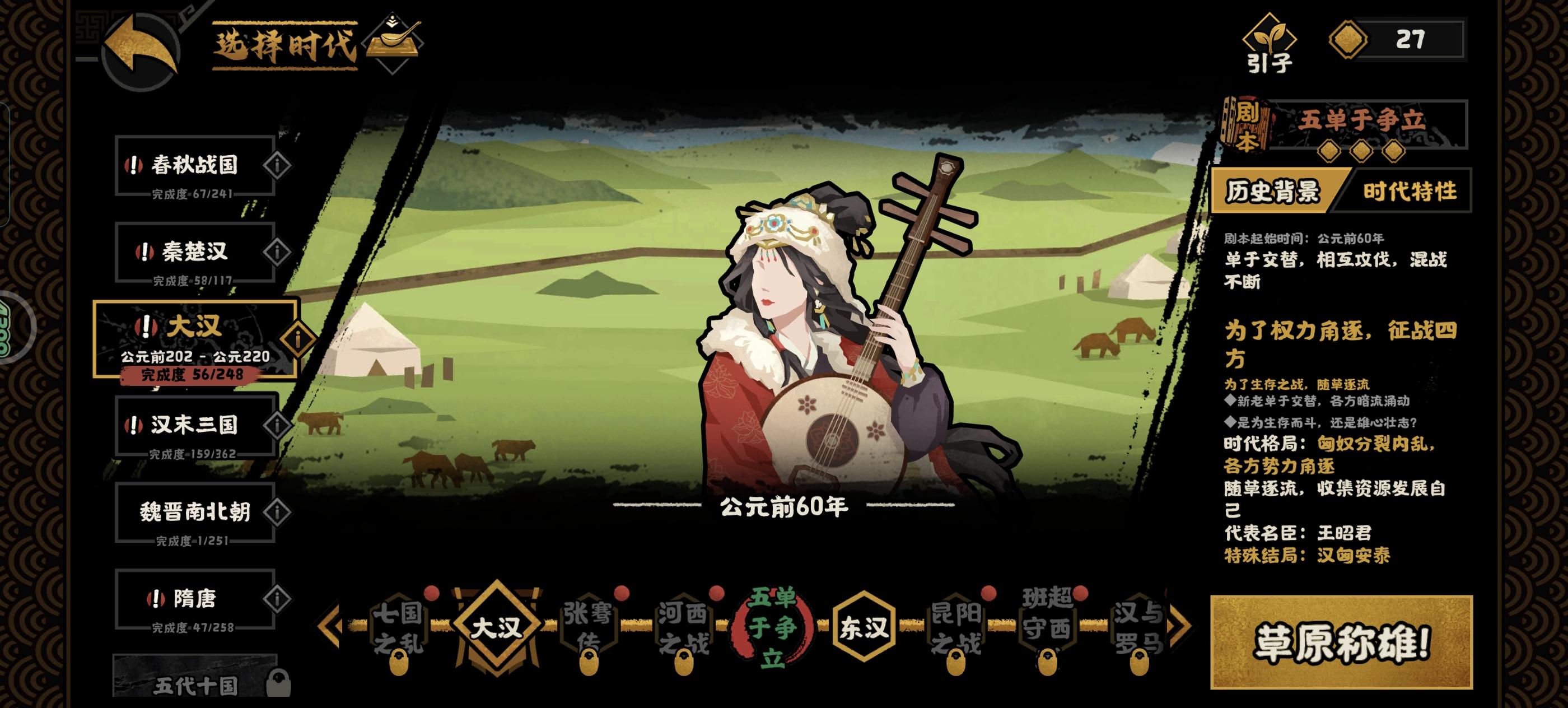 回归玩家来的,看见大汉就兴冲冲跑去玩了,上来就是匈奴侵扰,我想着我大汉怎么能和亲呢,直接跟他打,结果打了才发现匈奴战斗力加了100%,还是永久的,每次提战斗力匈奴就追上来,简直是军备竞赛,要跟匈奴拼战斗力,要探西域,要处理藩王,用一堆上古老名臣磨了两天才磨成功,已经燃尽了,之后的朝代不会也那么难打吧