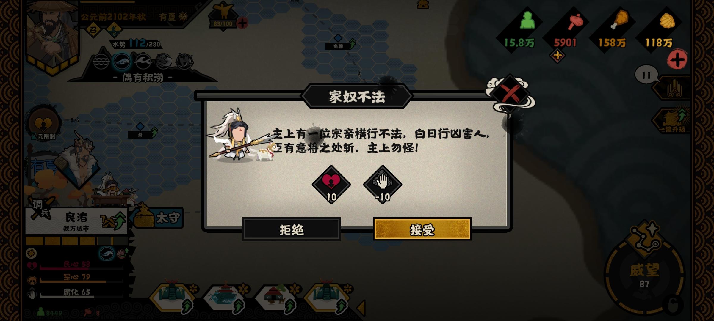 我的是科技弩队伍,开局拉完科技,就一直在爆锤匈奴了。这边这边匈奴都已经被打穿了。我我看见下边南越搞偷袭,我想着他的战力堪比小猫咪,我就没去管它。他打过来他打过来的时候,我大概用了3万守军,结果自动战斗没打过。当时当时我有点懵。刚好刚好他那个时间段连续发动了多次进攻,我就选了一个进攻试一试他是怎么赢的。我也不我也不欺负她,我就用了15000,比那3万还少了一半。结果他结果他娘的我一张卡