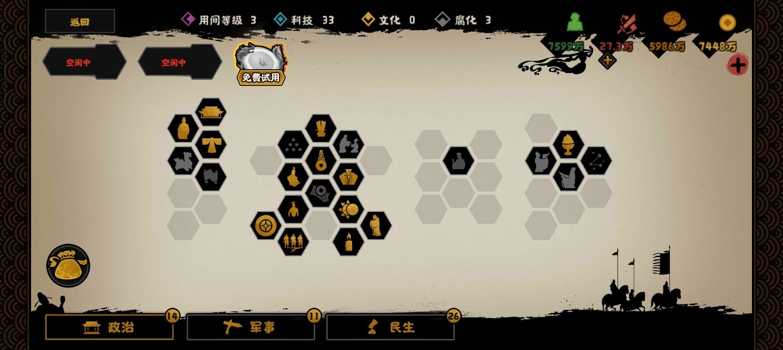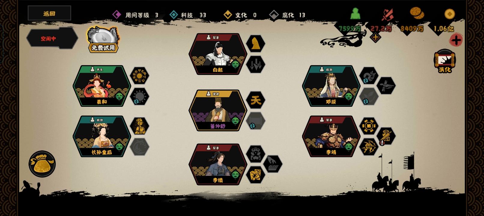 今天在翻名臣表的时候突然想到董仲舒也能加文化点,于是开了一把隋末大唐一共循环了9轮董仲舒的天人三策加了27文化点(开局先用一次罢黜百家!),研发了28次的兴灭继绝一共加了63战力,196军规,28科技名臣配队的话,加威望的必带(不带怎么会盟/科举!)加民心的可带可不带,不带可能卡在随机城70民心上