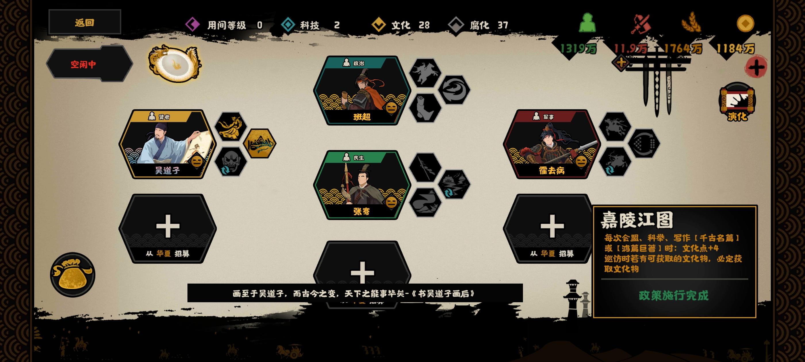 写在前面:各位王上们好呀,我是子在川上曰。依照惯例,根据名臣的实机政策做一个简单分析,一切效果以正式服为主,有独特的想法和见解也欢迎留言探讨呀~ 一、剧本政策①吴带当风 名臣重要政策,施行不需要特资。 施行后可获得5点文化点与2点科技 政策的优点在于:政策施行简便,无任何负面。 政策的缺点在于:无。 ②变相 名臣核心政策,施行需要至少拥有5点文化点,常规循环冷却为5分