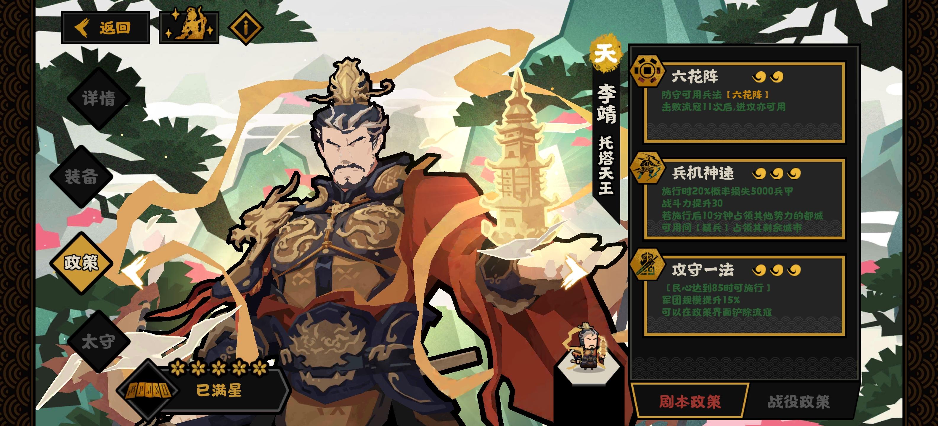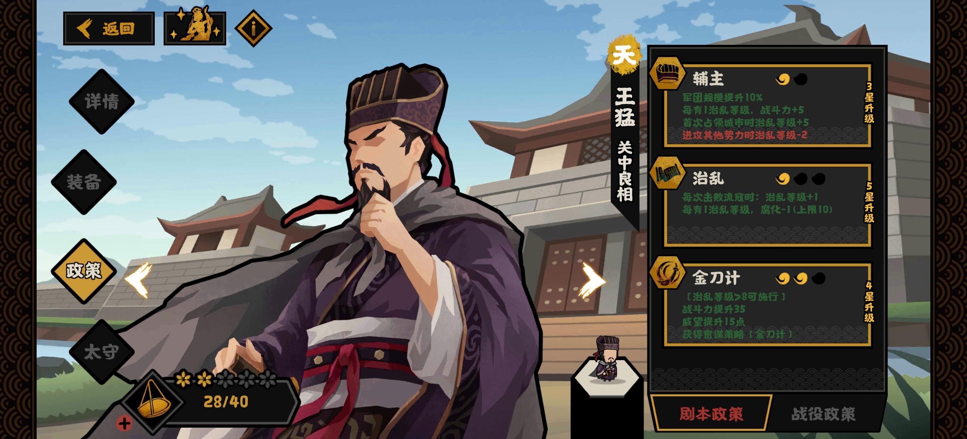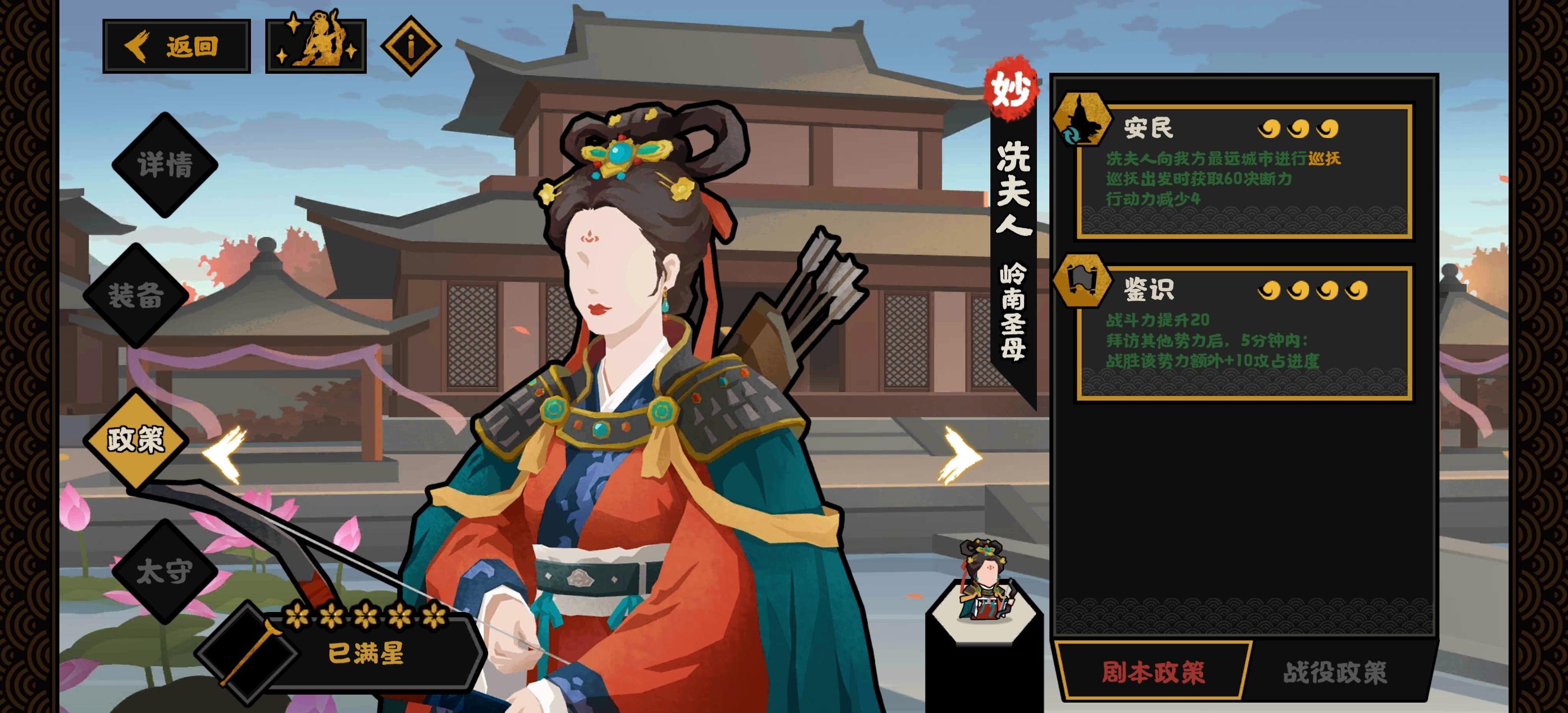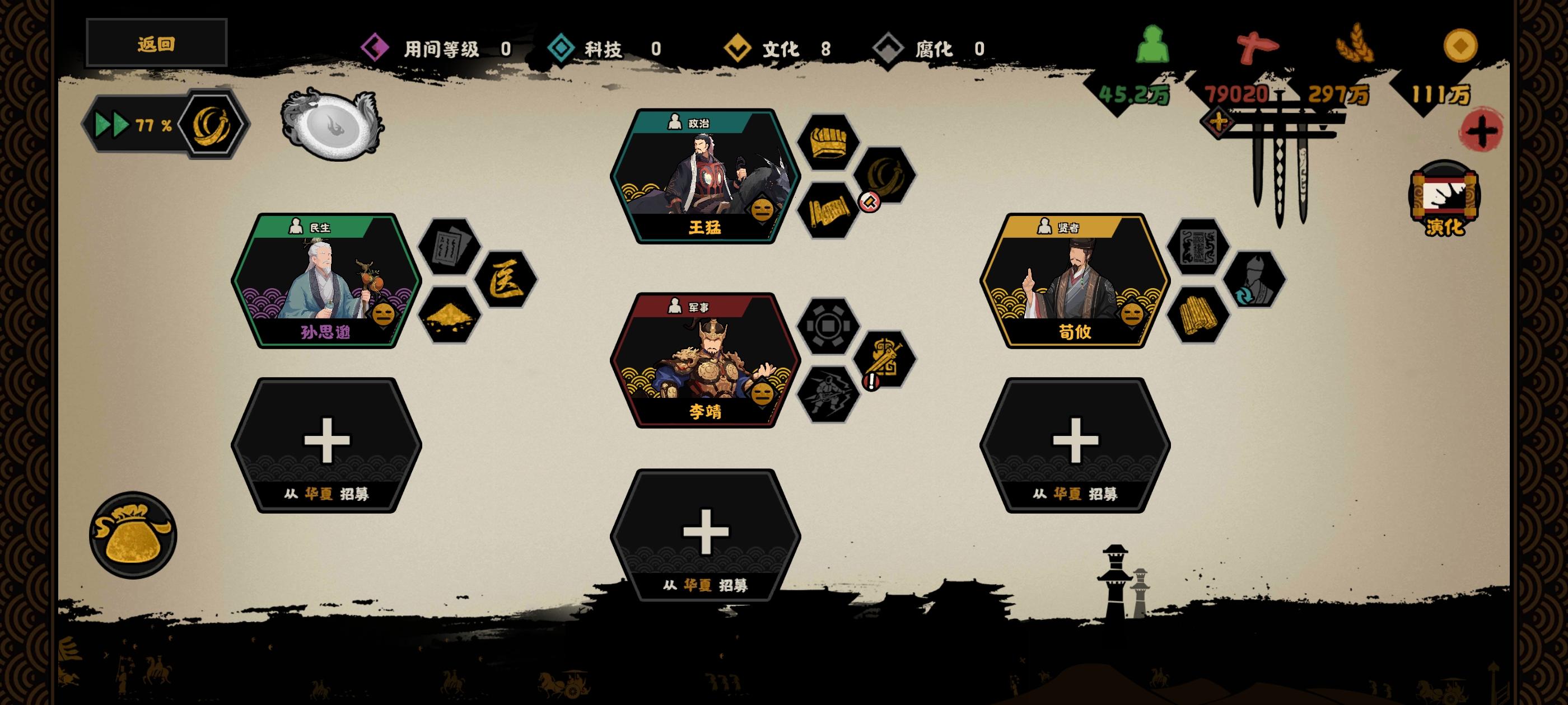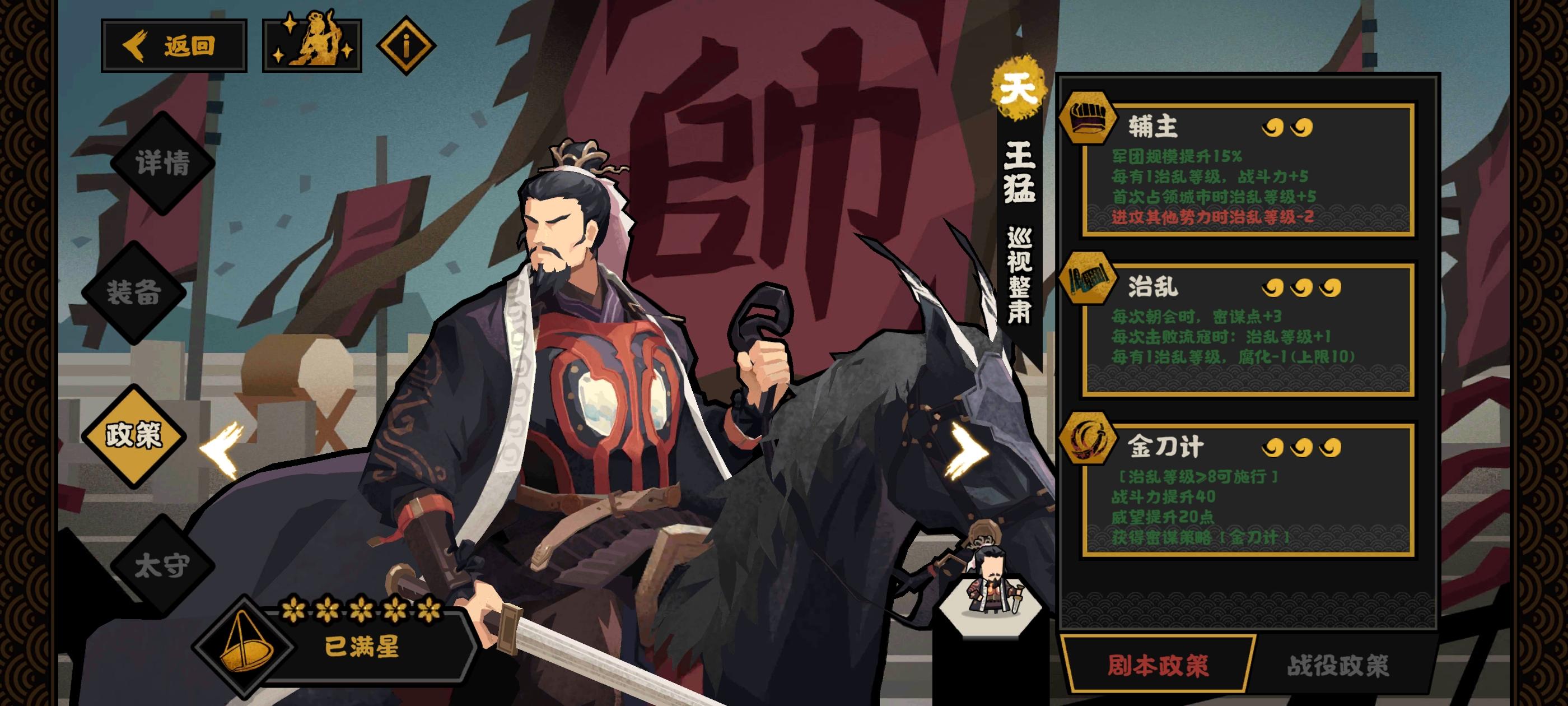 其实核心是给王猛配队,意外发现逻辑合理,除了冼夫人是妙,其他的都好拿。 开局王猛。点出治乱和辅主,冼夫人技能点一下,地图上清第一波流寇,有白城,先打个白城。然后清了流寇,清了第1波流寇。叠一层治乱,白城如果打两次,最后层数应该是5层,在打了第2波之后应该叠到6层了,这个时候可以看一下民心有没有达到要求,然后点宝塔,不够就用陶渊明加一下,或者如果一开始选的是张昭点一点,或者开局带君主文物的时候,带