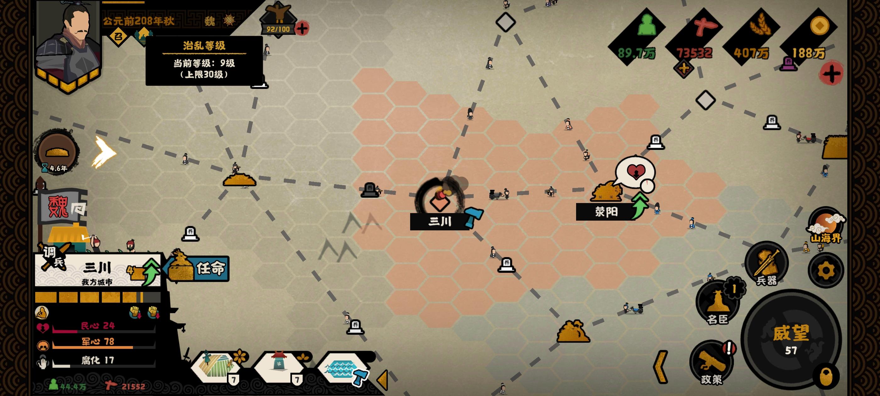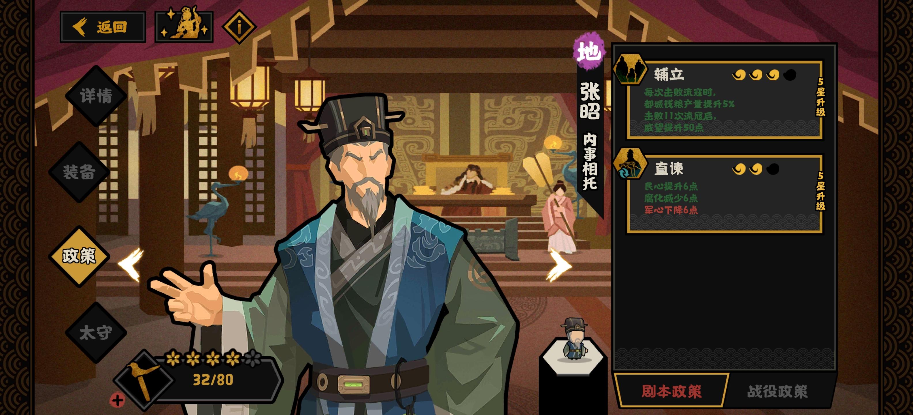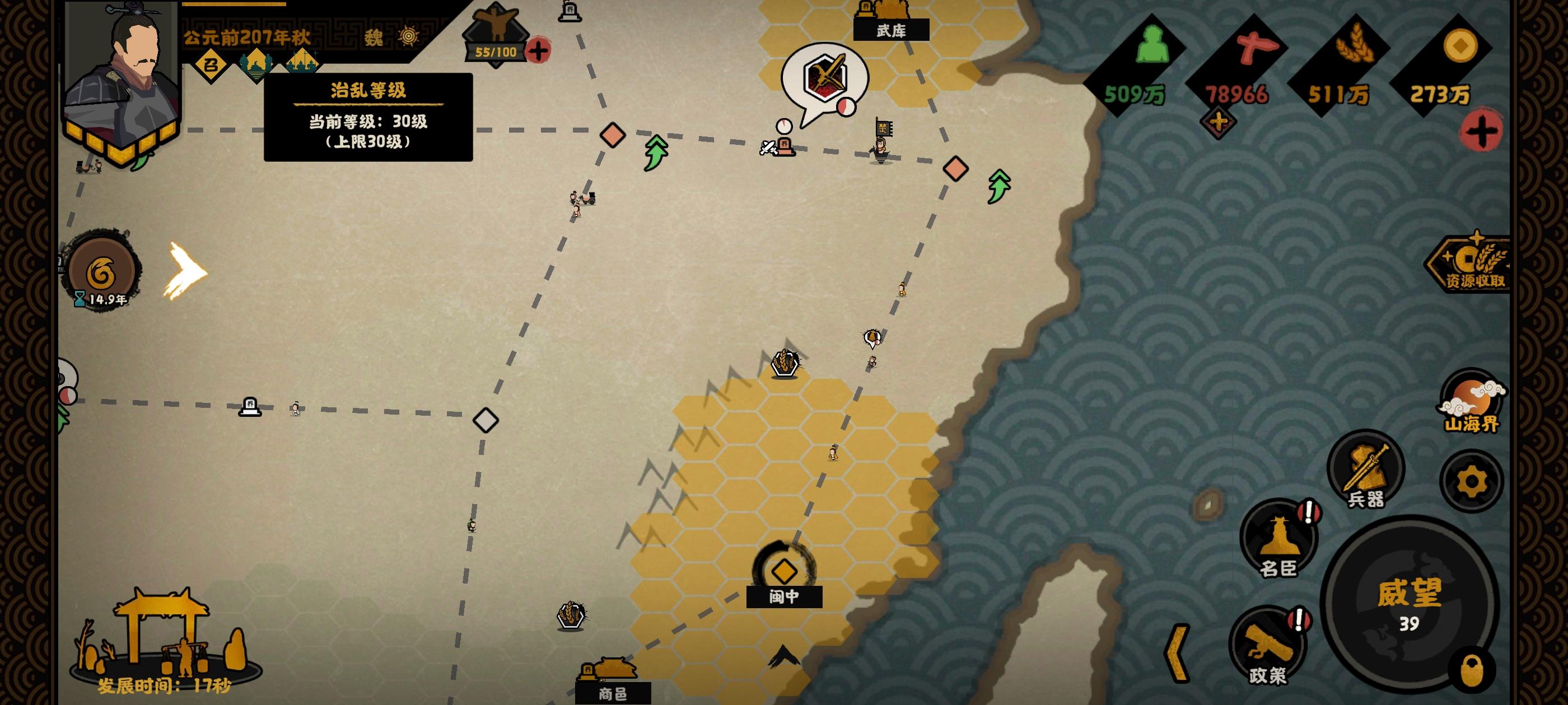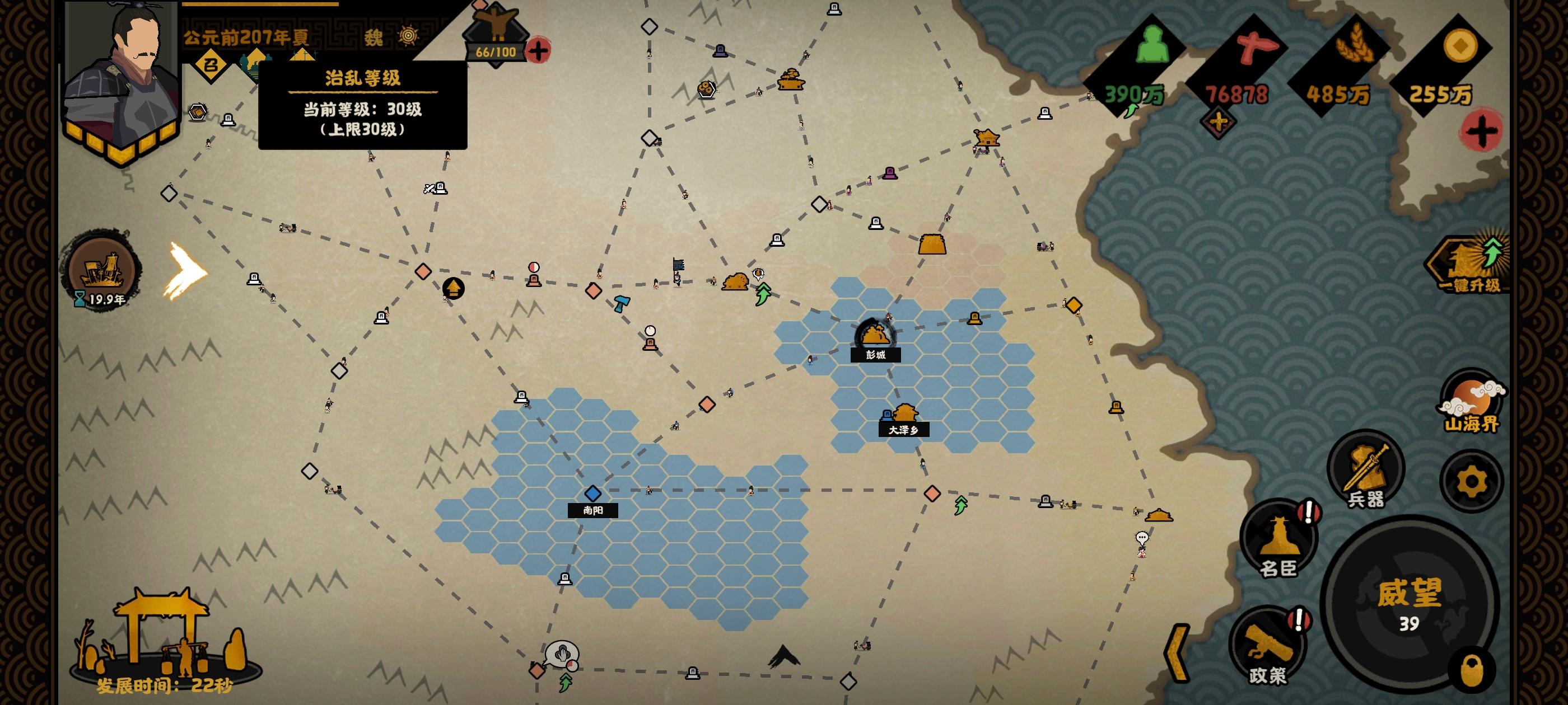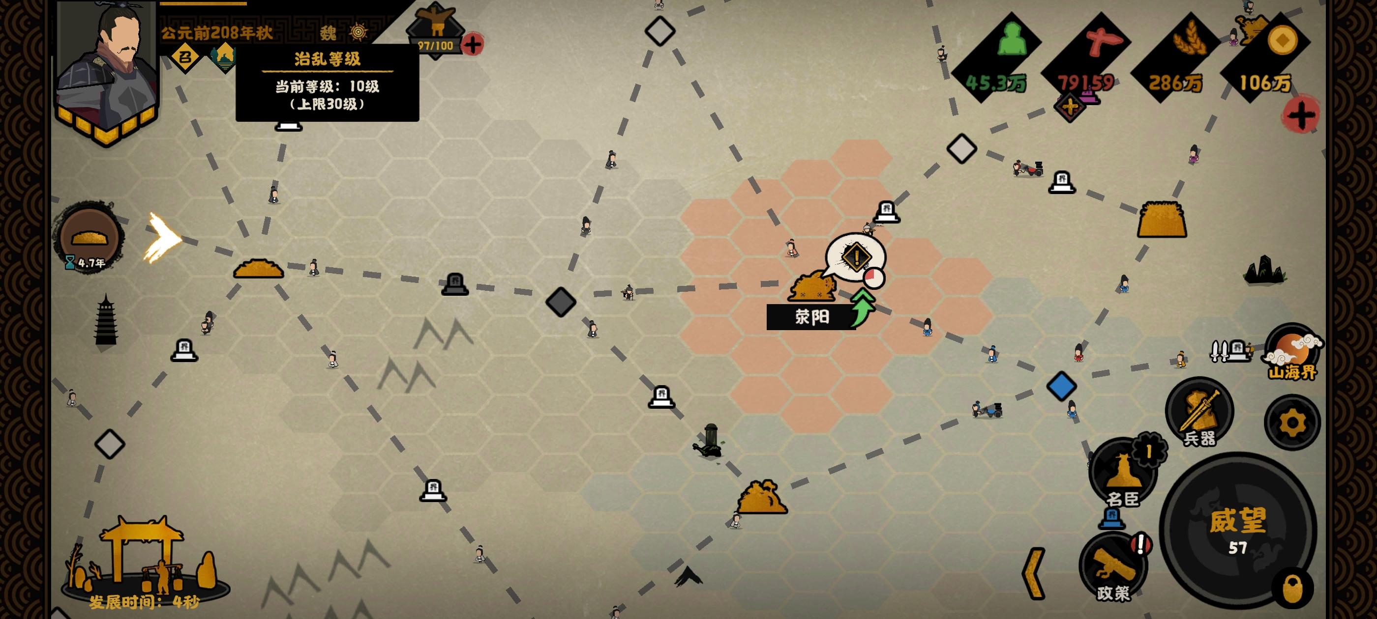其实核心是给王猛配队,意外发现逻辑合理,除了冼夫人是妙,其他的都好拿。 开局王猛。点出治乱和辅主,冼夫人技能点一下,地图上清第一波流寇,有白城,先打个白城。然后清了流寇,清了第1波流寇。叠一层治乱,白城如果打两次,最后层数应该是5层,在打了第2波之后应该叠到6层了,这个时候可以看一下民心有没有达到要求,然后点宝塔,不够就用陶渊明加一下,或者如果一开始选的是张昭点一点,或者开局带君主文物的时候,带