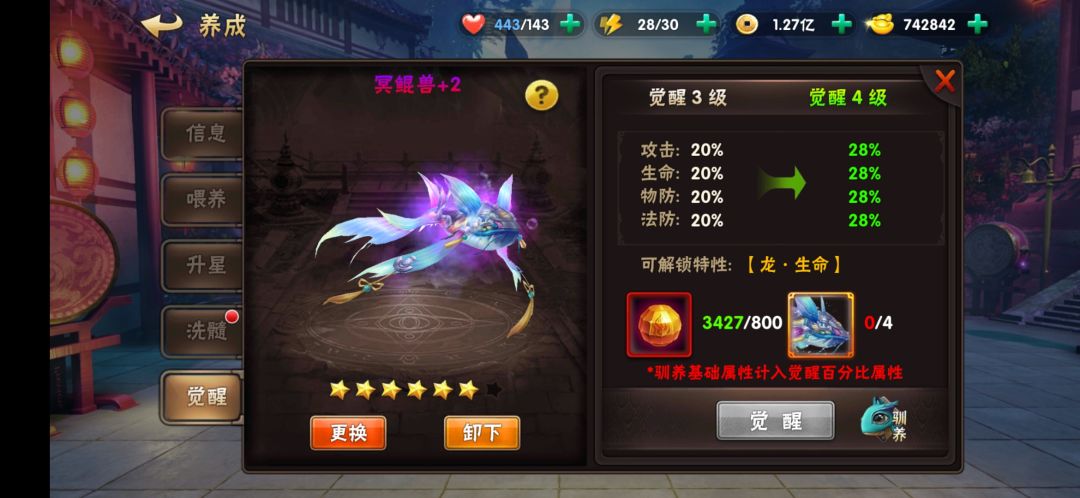 应小伙伴们的要求 先插一条宠物觉醒的帖子 刚好上个帖子金币消费漏掉了宠物 官职的晚点再发 宠物觉醒远远比升星麻烦 同样觉醒也是宠物提升最大的 宠物单单觉醒是没用的 一定要驯养 有很多小伙伴一看到驯养要消耗其他宠物就害怕 别怕 花50元宝重生 所有驯养消耗掉的宠物又会还给你 再就是宠物最缺德升星丹 这个东西普通和小资玩家建议用金币捕猎 点了金币捕猎之后手机往旁边一丢 别管了 因为很浪费时间 一般一亿金币能得到一千多升星丹 在这个过程中你还会得到很多宠物碎片 ss以下的宠物全部合成之后去分解了 分解得到的东西可以在商场买宠物 就买ss和sss宠物 大家一定疑惑为什么买这些垃圾宠物 其实sss宠物中也有复活 不倒 回怒等等宠物的 只是和ex比起来性价比低而已 可以过度用一下 当然它们最大的作用是用来给ex宠物做驯养的 毕竟全部拿ex宠物驯养太奢侈了 除了土豪 谁有那么多ex浪费啊 宠物必须要驯养升+战神以后才会激活战神属性和加攻击和免伤 不懂的就看看下面的那些图