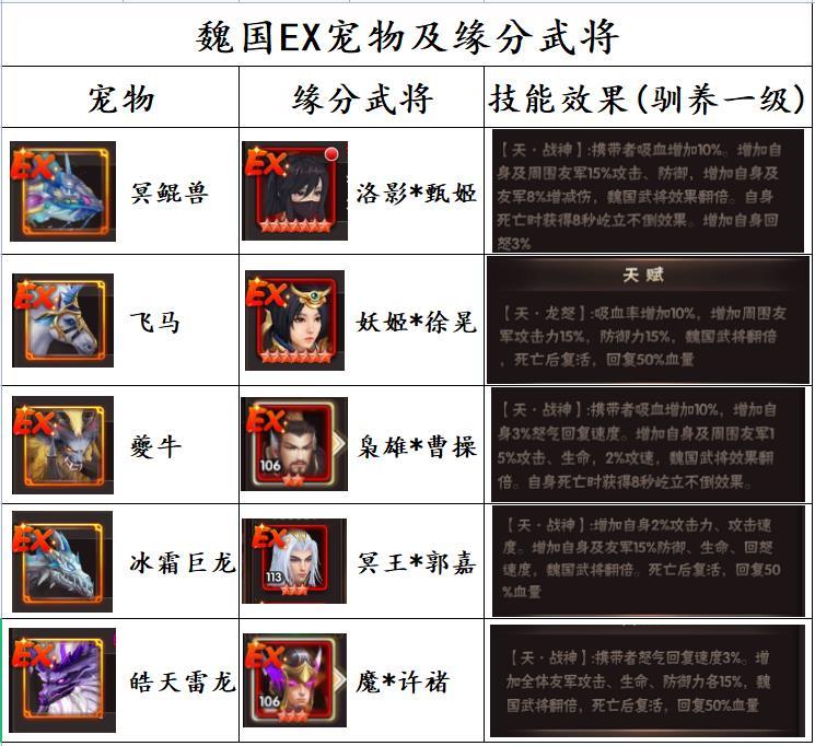 【崛起-终极王者】 史上最全的ex宠物及缘分武将合集 因为不好打字用表格显示,将资料用表格截图出来分享,四个国家的ex宠物及对应缘分武将合集来咯!虽然国家之间都有各自宠物,但仁者见仁智者见智,每个人对于游戏理解不一样,会尝试更多的宠物和阵容搭配,以下宠物仅作为资料参考! 宠物培养满总需要128个宠物,宠物升星需要25个宠物,觉醒需要55个宠物,驯养需要47个宠物【单纯用EX宠物驯养】 驯养所需经验32500经验,SS宠物是100经验,SSS宠物是500经验,EX宠物是700经验。