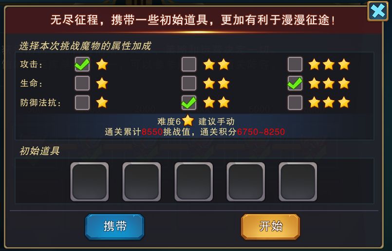 大家好我是m1的倾城 最咸鱼的远征玩家以前都是两次3星通关远征 但是感觉太费时间就开始研究怎么打6星 推荐大家用这种6星打法 为什么要生命拉最高呢? 因为攻击最低大大提升了我这边佣兵的存活率 第一:怪的生命虽然高但是不能短时间造成我这边的减员 第二:如果我这边有牧师还可以每回合恢复 第三:可以很好利用技能机制 至于防御魔抗和攻击谁拉两星第一点已经说的很清楚了 接下来重头戏看看装备要不要合成升级 那