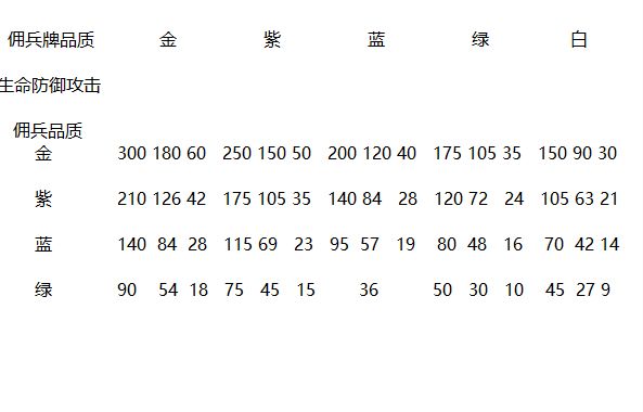 相信大家很多都不太了解 每周佣兵牌改兑换那些 又该怎样利用佣兵牌 所以给各位玩家写了个拥牌攻略 先看各种种类佣兵牌的属性 通过上图可以发现 每个品质的属性都是不一样的 这样就可以让大家利用每周仅有的碎片 兑换需要的佣兵牌 可是需要兑换那些呢?需不需要升3星? 而拥牌的功能主要是提升基础属性 相比第四组于前三组提升会小很多 所以只有佣兵5星了配上3星的佣兵牌 这个佣兵的作用才会有飞跃的提升 佣兵牌的