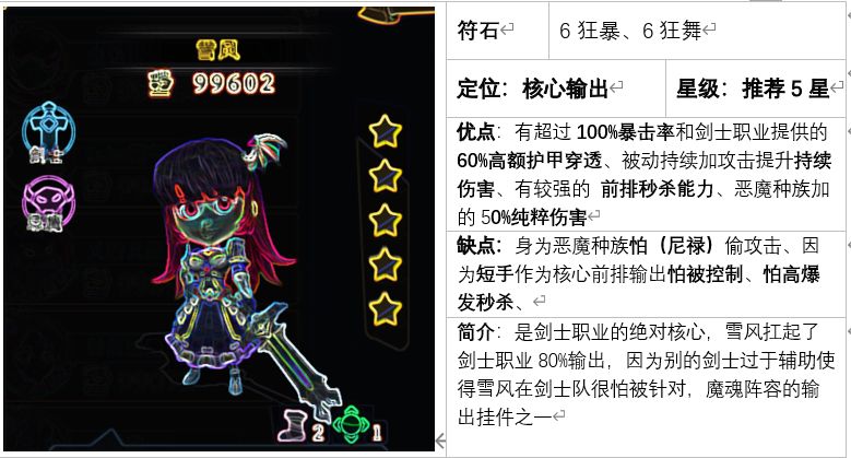 本期介绍的战士偏向进攻 周更(1/1) -------正文------- 名称:地狱犬(狗子) 品质:蓝 种族/职业:恶魔、野兽/战士 天赋简介:1.锋利:加攻击。2.撕咬:攻击概率附带流血2回合。3.蚕食:攻击带有负面状态目标时伤害增加。4.炎狗:能力,回合开始若站在燃烧地面上攻击暴击增加。 技能简介:1.跳跃:跳入敌方中央,防御增加2回合。2.重击:单体物理伤害。 泛用性: 获取难度:⭐ 推荐