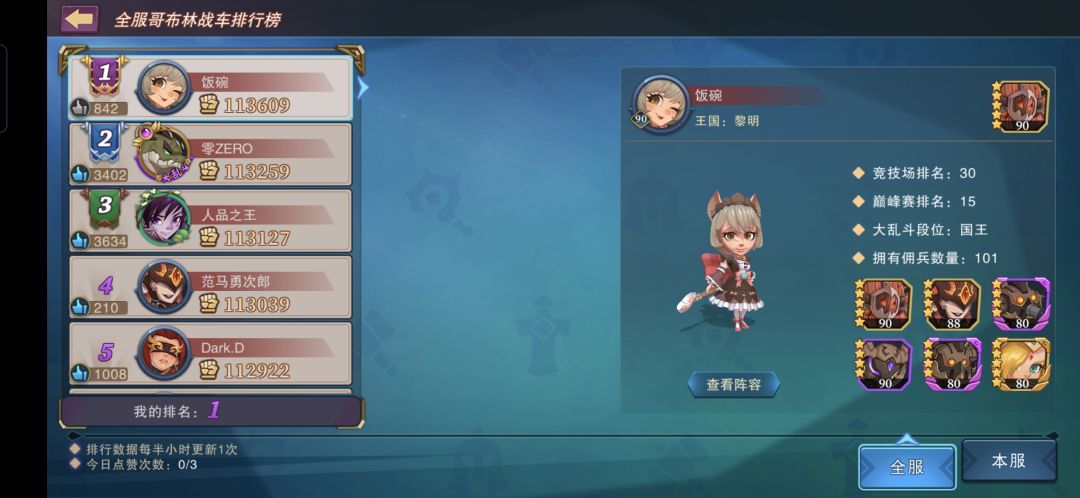 目前拥有90级三进佣兵31个,80级二进佣兵16个,红符石31套,+15装备14套,武器戒指+12其余+15装备33套。满星稀有金五个:龙骑、盾骑、始祖、尼禄、萨丁,时装13套。 PVE伽蓝25层,无尽之路56层,无尽旅程7层,起源121层,女神50层。 主力阵容:游魂盾骑,战力1037462,猛的时候啥阵容都能赢,萎的时候啥主流阵容都打不过,主打一个随机,全靠AI发挥。 四套不重复的阵容: 游龙