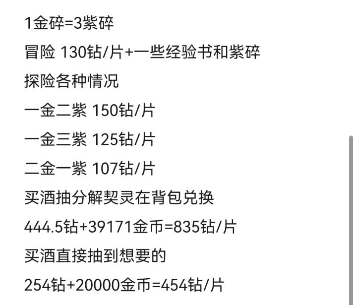 大家好,我是m9萌新 黄泉比良坂,最擅长精策和白嫖。本帖计算了各种渠道金碎的获取价格、节日返利档位,列举了各种物品的标准价,最后规划💎的方案一、各个渠道一片金碎的获取价格酒馆以官方给出的概率得出的期望值为准,应该没问题,有不对的麻烦大佬指出。基于此可以得出结论①如果精英关金碎有需要的,冒险必须打满五次,体力不够花钻买,这是全游戏最赚的金碎获取途径②买酒,只有直接开出你需要的稀有金才是赚