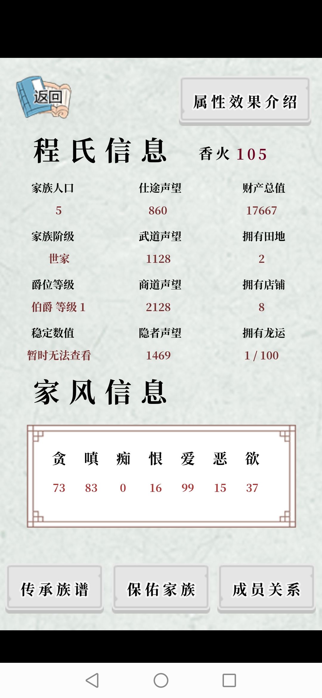 如图所示,我们一开始在选定属性的时候。贪嗔爱目前是良好属性,因为这样一开始有语音,你在有房屋和田地的时候积累财富(经商)。