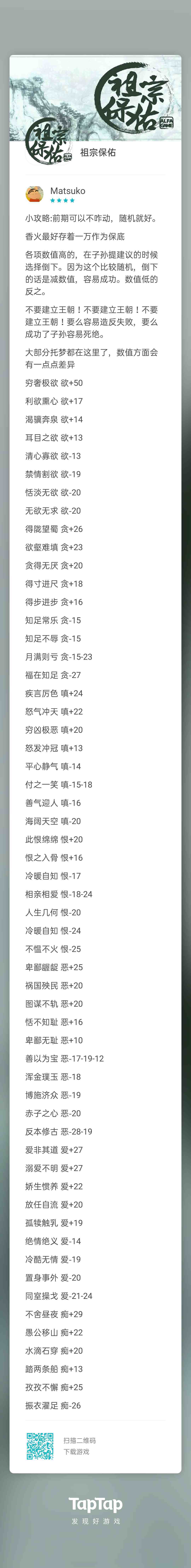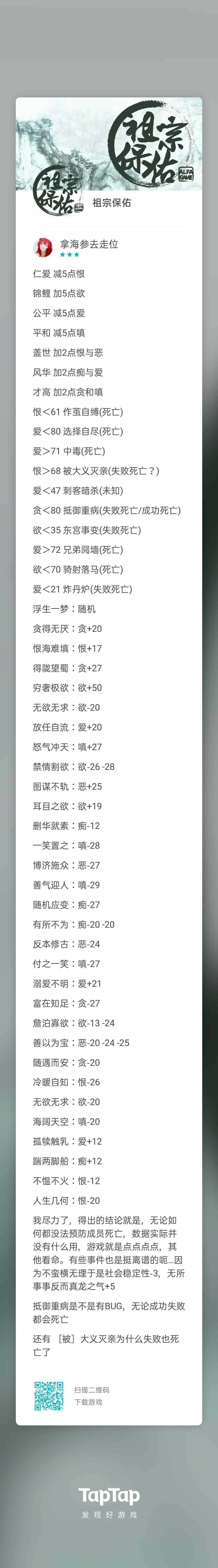 天资+天赋 仁爱 减5点恨 锦鲤 加5点欲 公平减5点爱 平和减5点嗔 盖世 加2点恨与恶 风华加2点痴与爱 才高 加2点贪和嗔 家风 恨<61作茧自缚(死亡) 爱<80 选择自尽(死亡) 爱>71中毒(死亡) 恨>68 被大义灭亲(失败死亡?) 爱<47刺客暗杀(未知) 贪<80 抵御重病(失败死亡/成功死亡) 欲<35东宫事变(失败死亡) 爱>72兄弟阋墙(死亡) 欲<70骑射落马(死亡) 爱