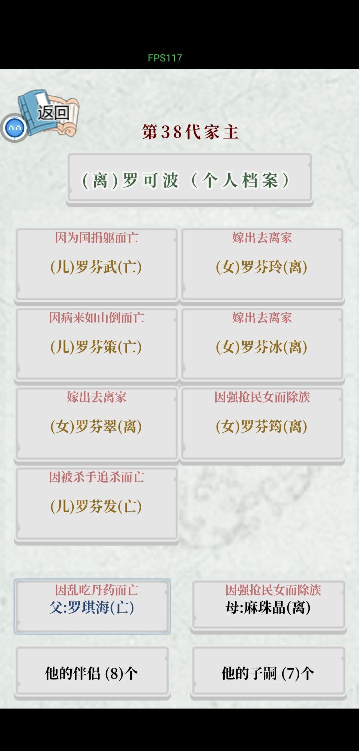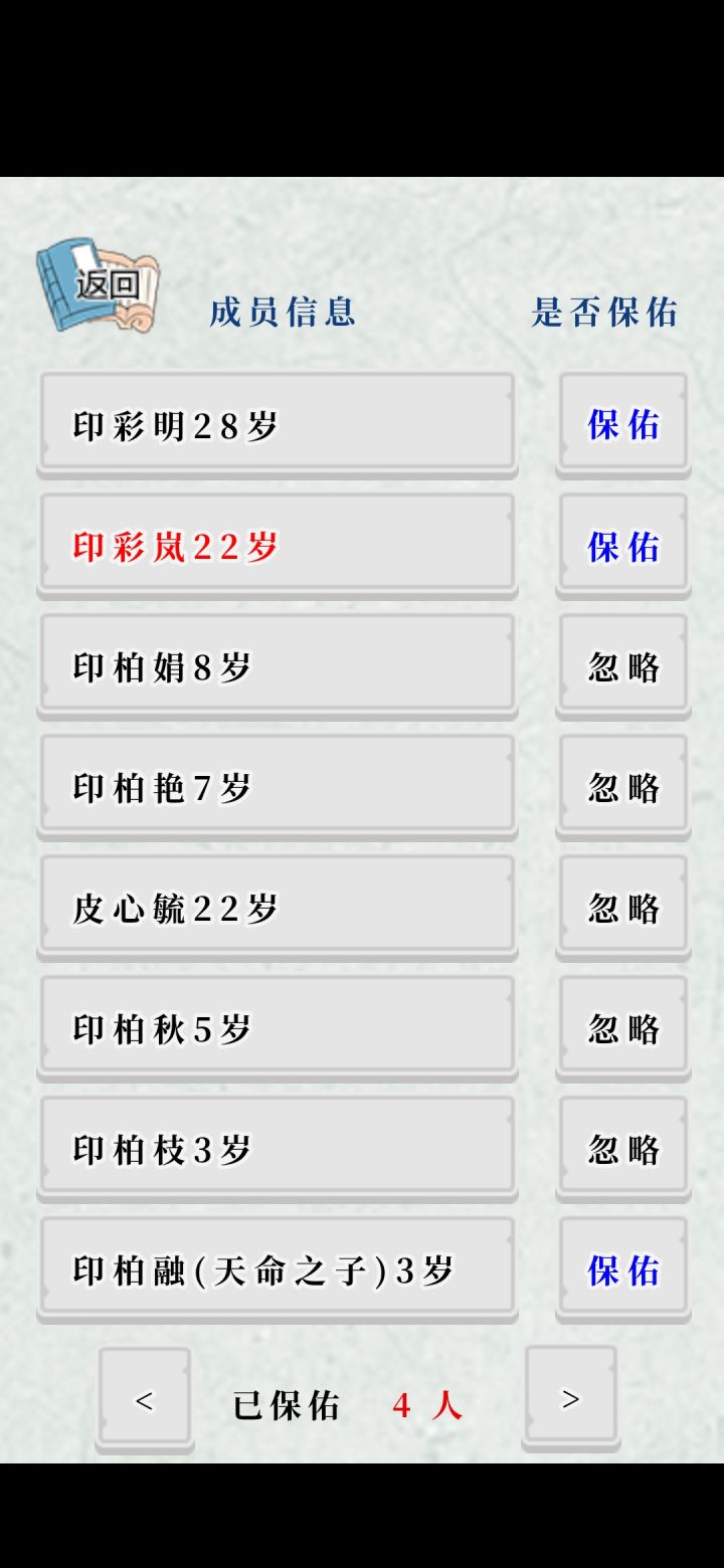 天资+天赋仁爱 减5点恨锦鲤 加5点欲公平减5点爱平和减5点嗔盖世 加2点恨与恶风华加2点痴与爱才高 加2点贪和嗔家风恨<61作茧自缚(死亡)爱<80 选择自尽(死亡)爱>71中毒(死亡)恨>68 被大义灭亲(失败死亡?)爱<47刺客暗杀(未知)贪<80 抵御重病(失败死亡/成功死亡)欲<35东宫事变(失败死亡)爱>72兄弟阋墙(死亡)欲<70骑射落马(死亡)爱
