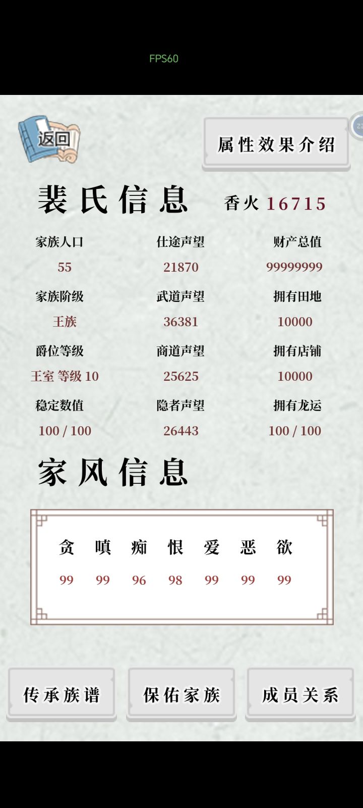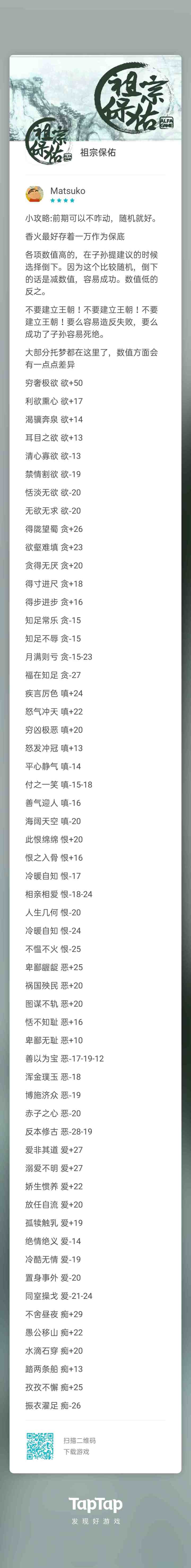 这个游戏的通关方法已经被开发者写在最初界面了。作为一个祖宗以及牌位的存在,就好好的看着家族的更迭,尊重后代的选择,好好的被放在宗庙里被人敬着就可以了。作为当世人则是一辈子摸爬滚打,多学本事,多积名望,偶尔给祖宗上上香,以家庭家族观念为主才能经久不衰,报团取暖才能兴旺。另外,高处不胜寒,风景很好但风也很大,高处只容得下几个人,人多则容易离心离德。