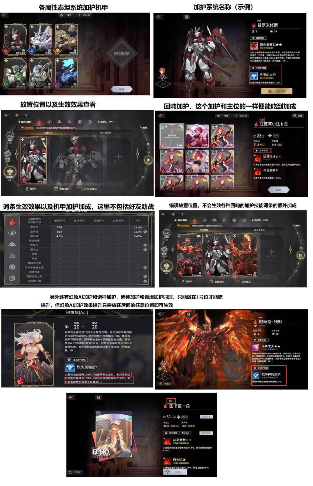 我用火的做示例,其他属性同理。泰坦(方阵)加护技能机甲适用于在各个多人本中掉落的回响(盘),而诸神(王)加护技能适用于在邂逅里的回响池抽到的。再根据自身装备的回响类别数量来决定用什么机甲作为主召唤位。加护技能影响了很大的输出和生存。诸神盘多但是没有王的小伙伴也可以在商会购买诸神限定礼盒,或将任意一个回想升到80然后前往活动领取一个假王(残影)自选来过渡用。泰坦(方)盘多的小伙伴建议将泰坦(方)机甲