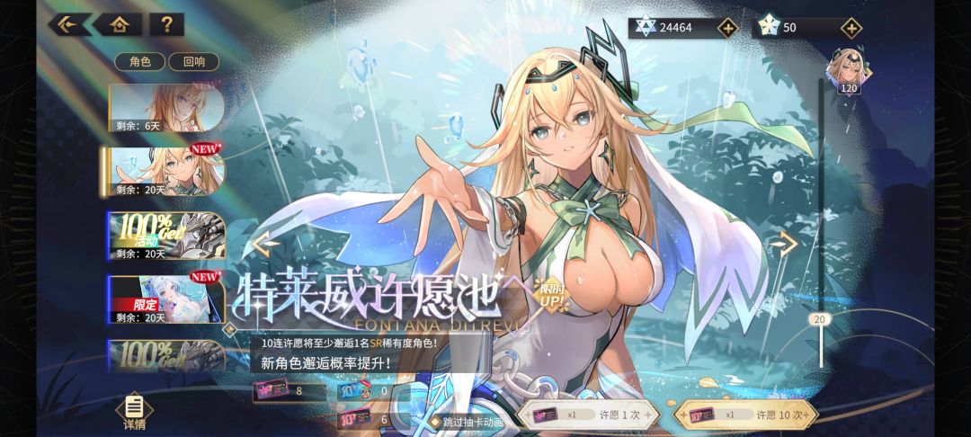 原来是玩光队的,发现三十万战力的光队脆的和纸糊的一样,临时整了个水队,25万战力差一丢丢。 先上个通了的图 首先是阵容:主角影,伙伴是菲林,花凛,霍莉,莉莉安。因为玩的时间短二阶主角都没满级,所以主角技能是通用驱散(46和50层必用,其他层可以换别的),系列割裂。 当然我是有冬至和罗兰的,但是实验后发现自动打过不了。 然后是回响:我运气比较好,光回响池子八个十连出了两个雅典娜,所以就用了一个吟游诗