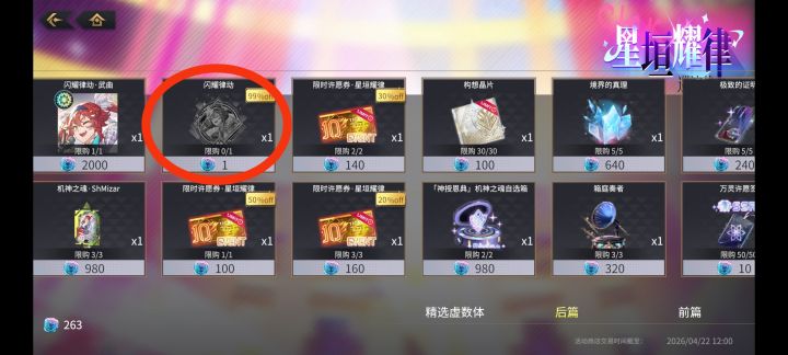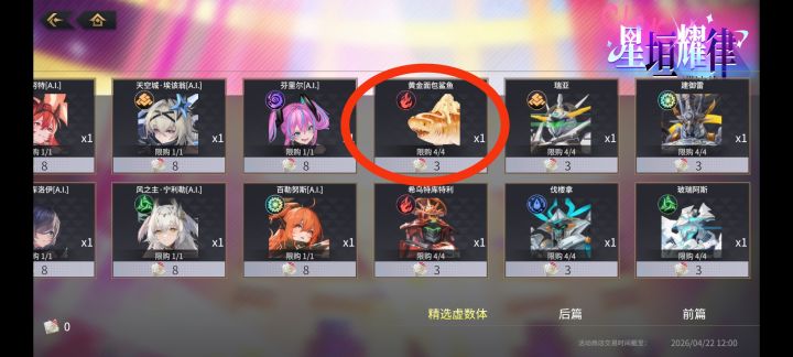 新虚数体闪耀律动武曲,有没有用先不用管,如果你不是从上周活动开始第一天每天都买20个礼盒(概率获得门票),应该是攒不到2000货币,那只能放弃虚数体选择别的。图一到图三,两个老皮肤复刻,兑换之前确定一下没有获得再拿。图四图五,武曲新皮肤,1货币兑换基本是白送,必拿的。图六图七,虚数体推荐换个面包鲨,比如boss血量低于20%会释放一个全体眩晕,等主角被晕了就放不了机甲,提前一回合放只能持续1