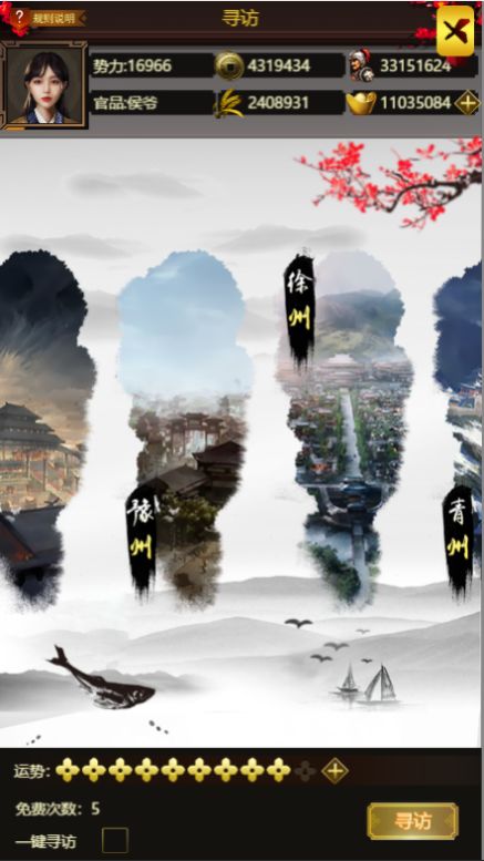 --寻访红颜篇胭脂粉袋,红颜佳人.这一期我们来做个寻访以及红颜的攻略.游戏中有着各式各样的佳人,我们通过途径认识佳人,取悦佳人,最终抱得美人归.什么?你说佳人不知道有什么用处?别急,下面我们来一一介绍佳人得获得和作用.寻访我们可以在游戏中的主城界面,看到寻访玩法的入口,如果看不到这个入口的话,那么可能时玩家的官阶还不够解锁这个功能哟,所以请尽快提升官阶吧.进入寻访界面我们可以看到多个地点