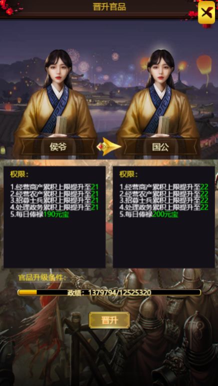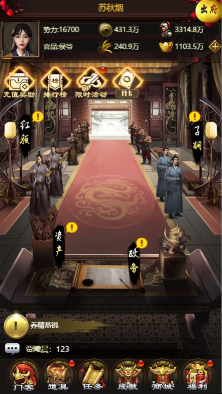 -主要玩法篇.首先打开游戏界面,第一个界面是我们的府邸,基本上我们的资产经营,资源产出以及政绩都可以从这个界面中去处理.1.政务关于政务,游戏中是每30分钟会出现一次需要处理的民间事务,处理事务我们可以获得资源的奖励,比如粮草以及政绩,粮草的作用呐,是决定我们招募士兵的重要资源之一,至于政绩更是我们提升官阶的必要.所以我们记得要及时处理政务,做个勤劳的官老爷哟~2.资产资产经营也是这个游