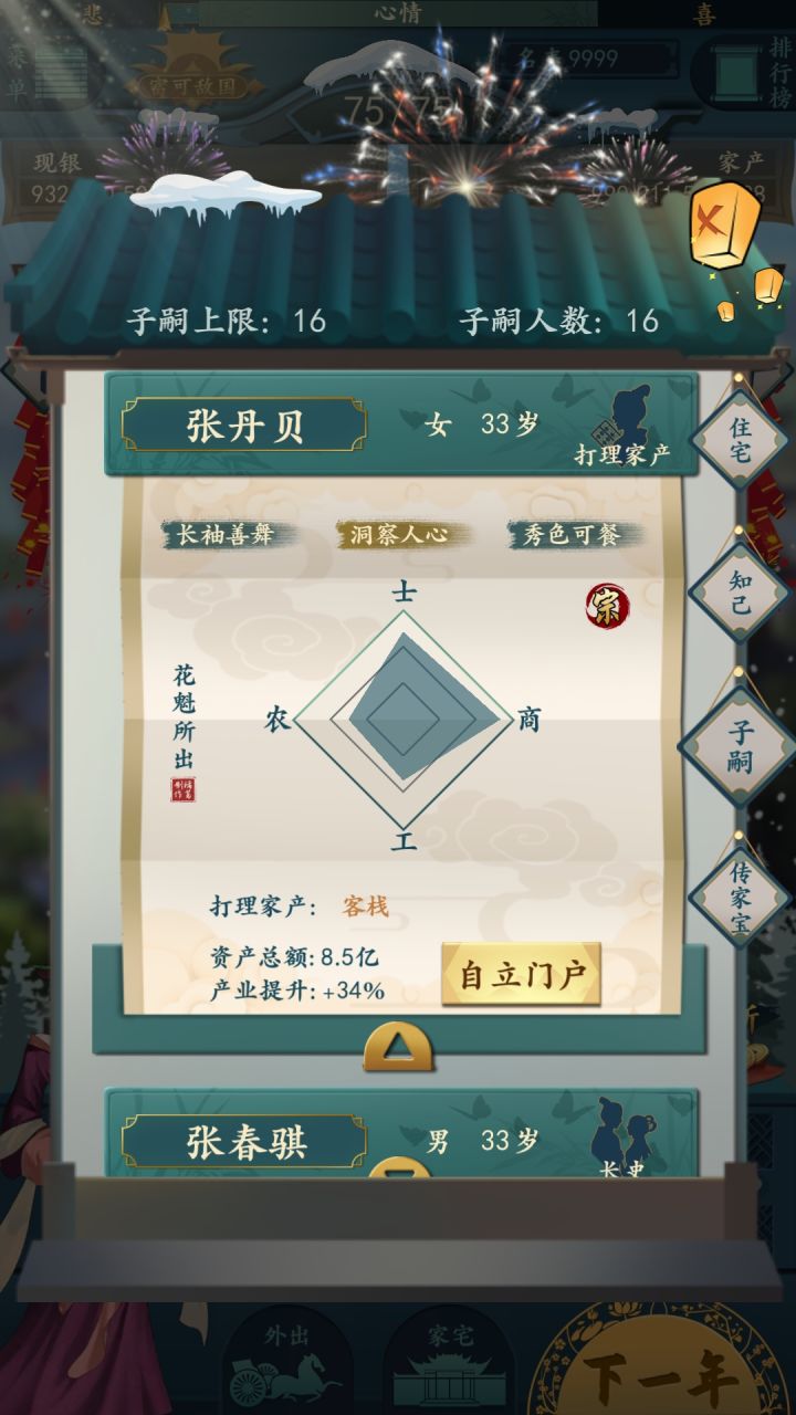 有很多朋友报怨说钱庄风险太高 没法玩 这里跟大家说下我自己的一些心得 不对别喷啊先说子嗣 想玩钱庄高商属性的子嗣是必备的 那么多高算及格呢 给大家看2张图大家看 这个是住宅加成后的效果 第一张是及格 第二张是满分 简单说就是过二线一半及格 越高越好只要商属性 别的不用考虑 知己里只有花魁和青蛇可以生出高商子嗣 黑店属性要差一些 如果前2个实在招不到 只能用黑店替代 再者管理钱庄是减风险好 不