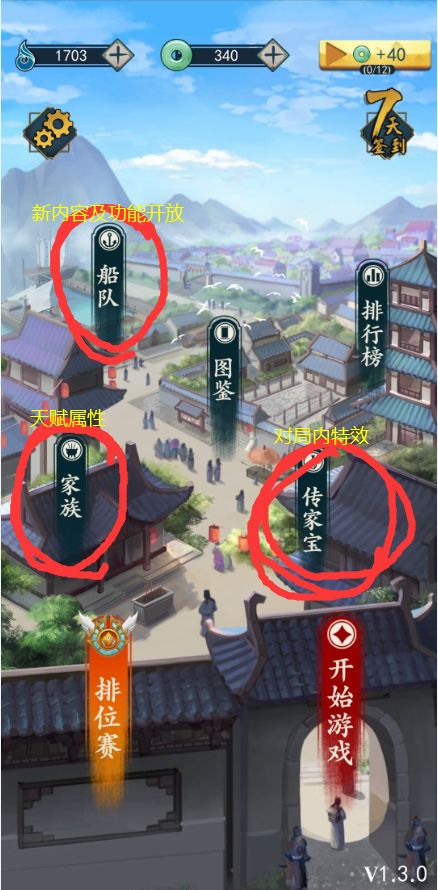结束了第一局体验局以后,主页面可以看到有3个不同的地方能够强化诸位游戏属性的地方:分别是家族、船队以及传家宝;一项一项来了解一下:家族点开后,直接出现的就是天赋页面;所有的天赋都需要支付天赋点(左上角蓝色那个,目前通过对局、完成成就两种方式获得)这里讲一下一些重要的天赋,建议早些点满从而更好的进行游戏:(按照从左到右一列一列讲)第一列:殷实之家:点满开局多10万金钱,排位尤其重要(黄金
