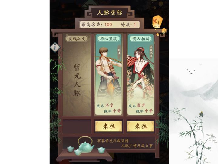 风流掌柜,百样人生,《一亿小目标2》发布全新版本,外出系统新增宴客玩法,知己戏痴技能升级,快来看看吧。【宴客系统】宴客玩法设置于外出页面,在这里,您有机会结识各类宾客,结识宾客的类型受玩家名声影响,名声越高,结识的宾客越强力。已结识的宾客可通过花钱游说,游说成功可获得强力奖励,奖励包括:下一年首饰必定暴涨,下次斗鸡必中,无风险开采盐矿等......但游说也有概率失
