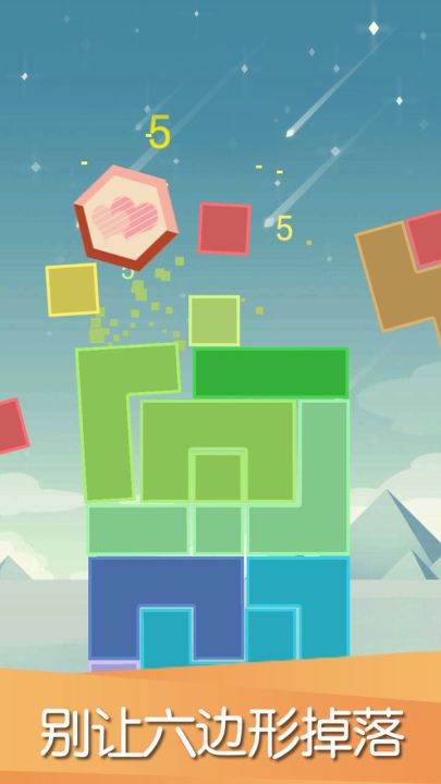 有一座各种形状的砖块组成的方块大楼,在这座大楼顶上有一个六角形的块。游戏的目标是将这个six六角形块从塔楼上降下来以获得分数。游戏时,要点击砖块使其消失,让六角形块下降到下面清空的空间中。