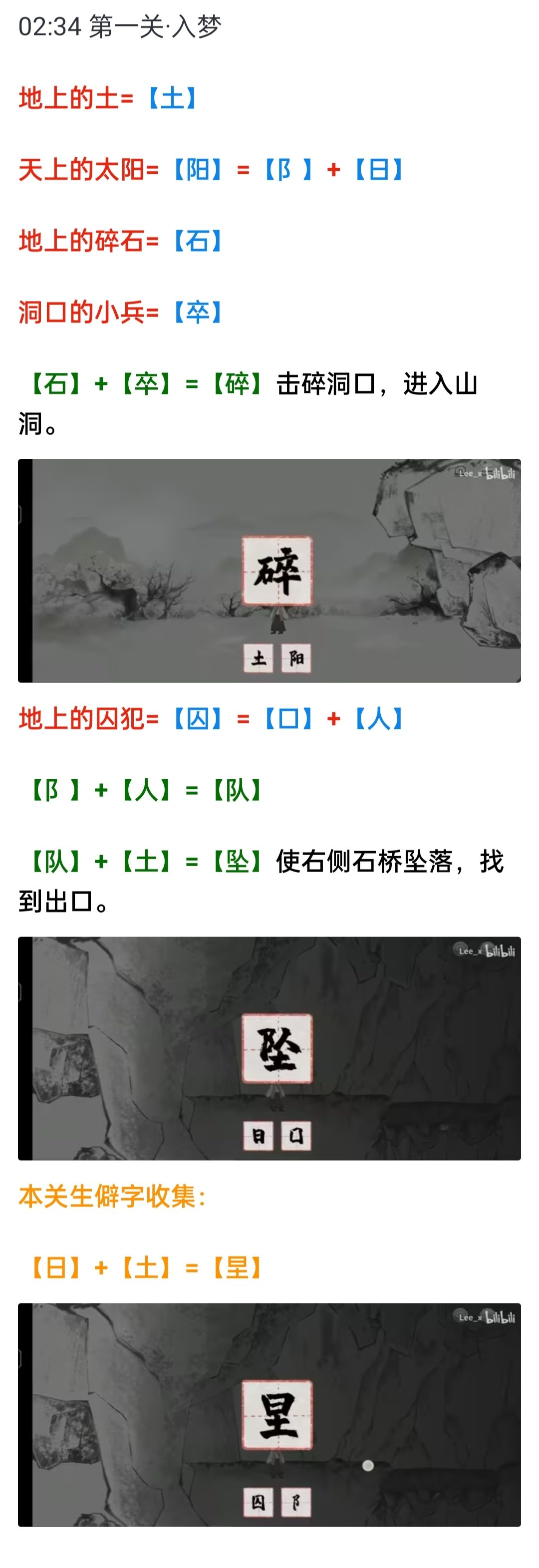 因为是纯文字的攻略所以肯定有不足的地方,我尽量有写清楚(可能看着比较麻烦请不要嫌弃啊—— 【入梦】 天上的太阳,得〔阳〕 地面的石头,得〔石〕 士兵前面的土,得〔土〕 和士兵对话完后,点击士兵得〔卒〕 〔石〕〔卒〕组〔碎〕,使用〔碎〕把堵住洞口的石头破开 点击囚犯,得〔囚〕 〔阳〕拆〔阝〕 〔囚〕拆〔人〕 〔阝〕〔人〕组〔队〕 〔队〕〔土〕组〔坠〕 使用〔坠〕让石板掉落下去 —— 【暗探】 点击萤