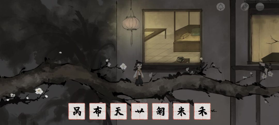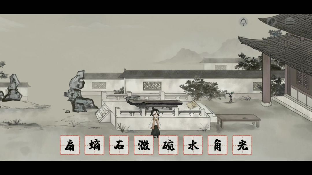 亭子里的“羽” 琴台左侧石头 石头放在琴后面断石上 琴右侧有“碗”和字 在水池周围找字和桶,桶装水,水浇树苗在最右侧,得到“杏” 碗和两个拆开的杏,组成宫 乐谱: 角商角商,徵商宫羽