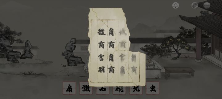 亭子里的“羽” 琴台左侧石头 石头放在琴后面断石上 琴右侧有“碗”和字 在水池周围找字和桶,桶装水,水浇树苗在最右侧,得到“杏” 碗和两个拆开的杏,组成宫 乐谱: 角商角商,徵商宫羽