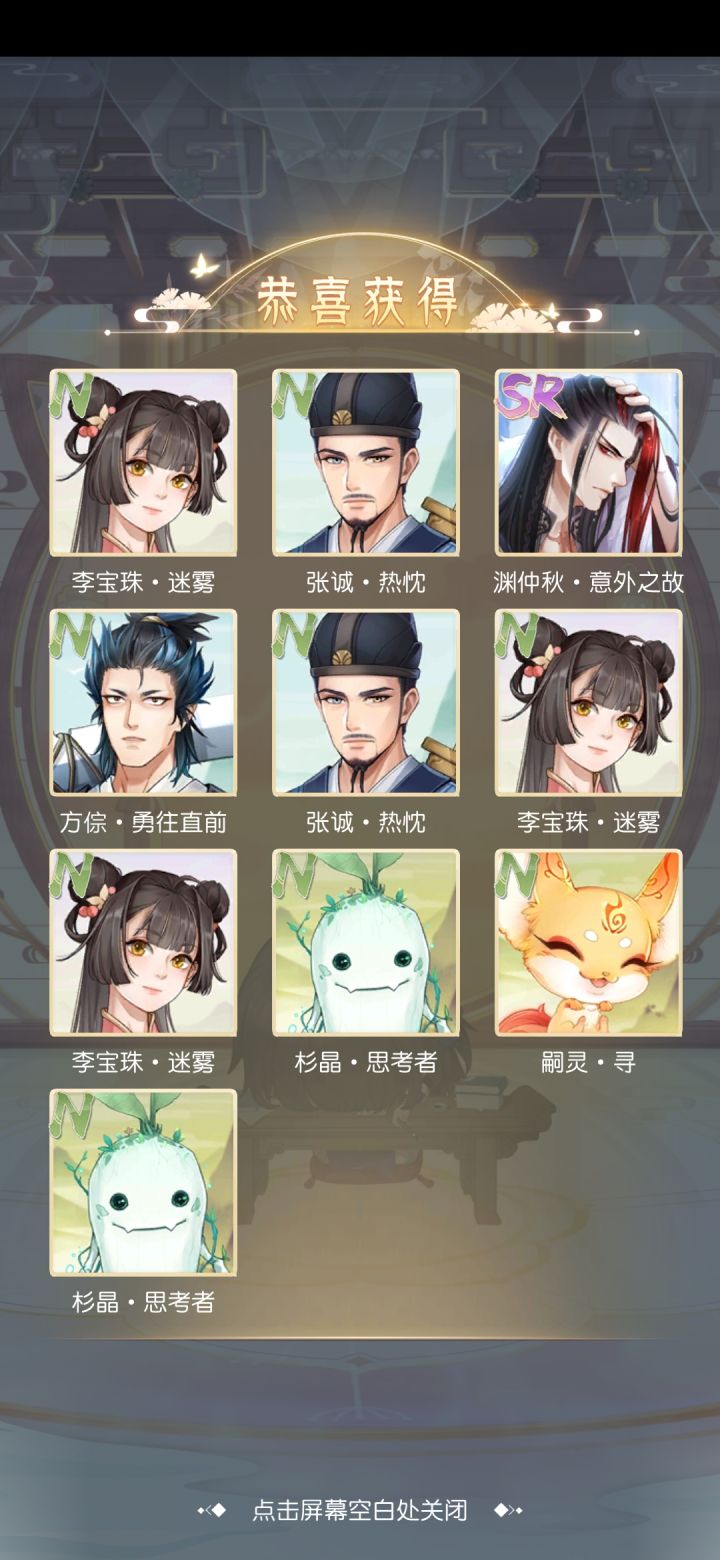 SR:任天涯·无懈可击;苏慈·雨中花;唐瑭·杏;渊仲秋·任务;渊仲秋·意外之故。
