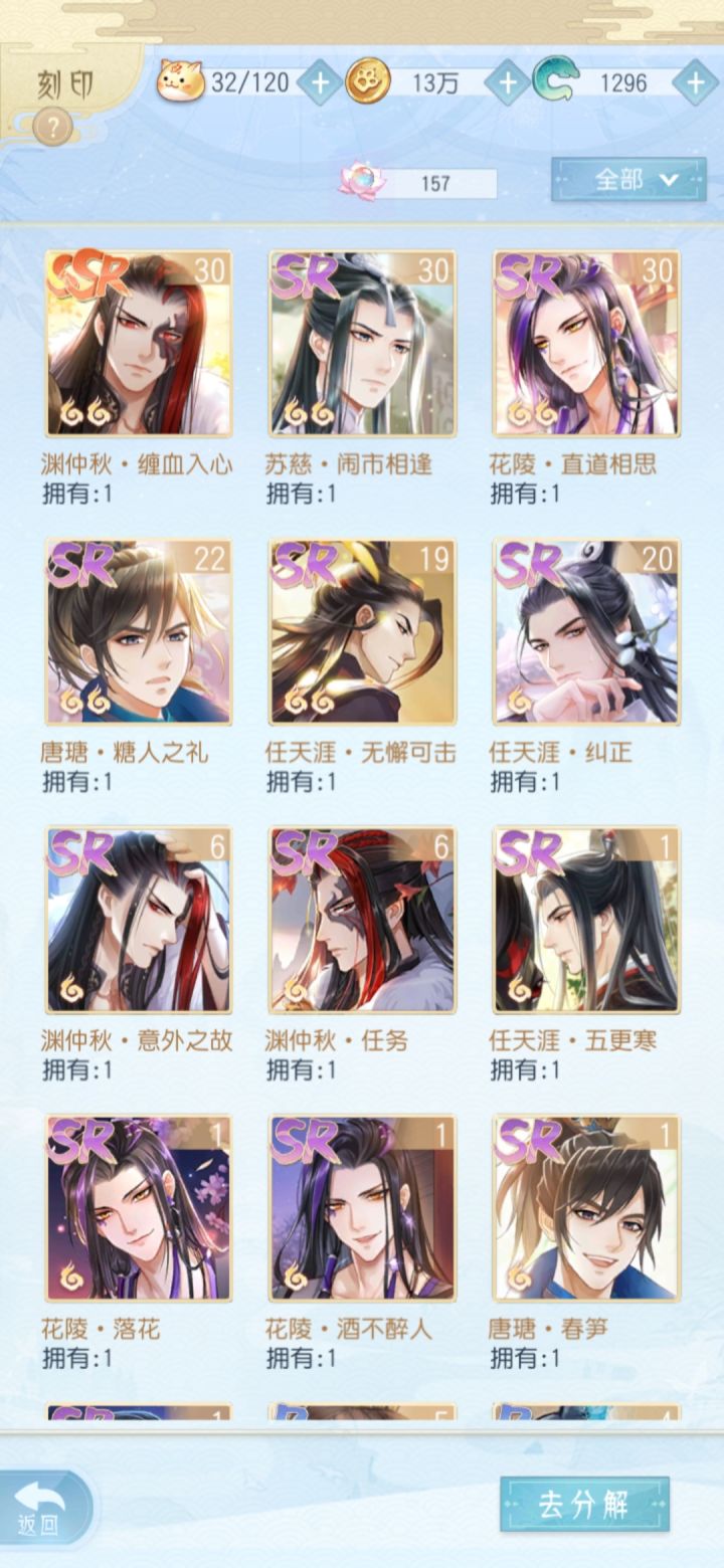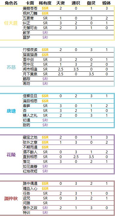 天资 通识 御灵 这三项属性感觉用得多 好过任务...所以想问 有哪些卡面 这三项数值高...SSR:暂未发现前三项属性优势卡面。SR:任天涯·无懈可击;苏慈·雨中花;唐瑭·杏;渊仲秋·任务;渊仲秋·意外之故。另外,渊仲秋·问路暂未计入卡池公示名单,实际金币池可抽到其碎片,拓印阁可兑换...更新!感谢提供卡面的小伙伴,附已知卡面:(数字越大 代表属性数值越高;稀有度+“!”可肝碎片)