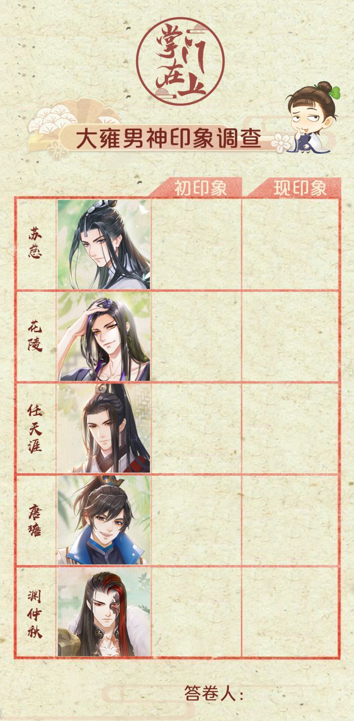 报…报报报!(气喘……)报告掌门大人!龙虫斋正在征集「大雍男神印象调查」邀请最了解几位男神、最沉迷八卦的掌门大人一起参与!!!参与时间:10月18日——10月23日参与方式:带话题#掌门在上# 在微博发布你填写的「大雍男神印象调查」并 即可参与活动,微博点赞数最高的五位掌门大人将获得【明信片套装】一份。活动传送门:掌门大人和大雍男神们都这么熟了,肯定很快就能完成哒!(*´∀`*)听