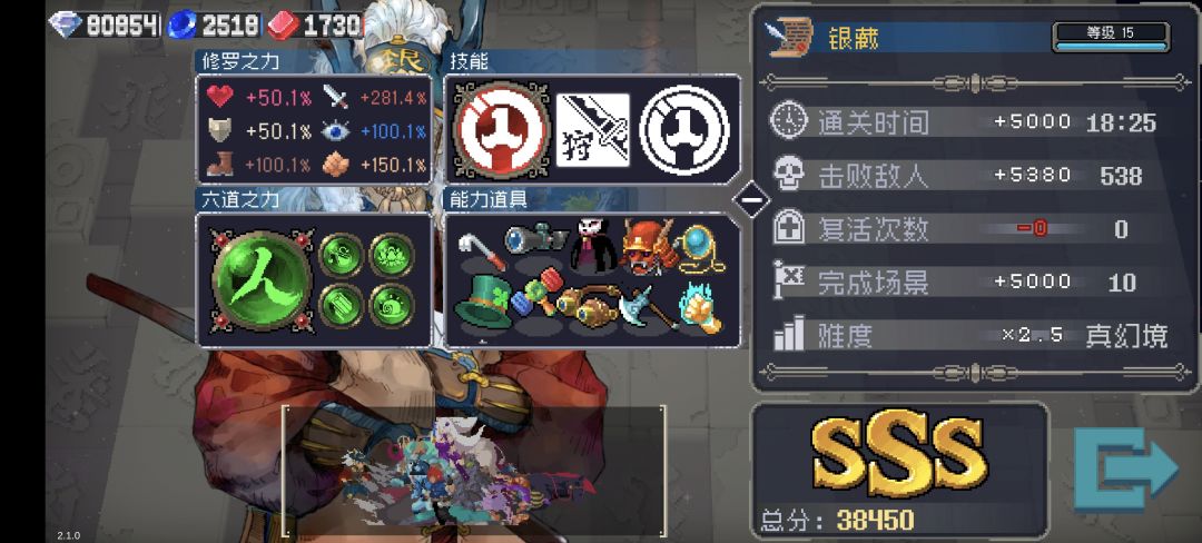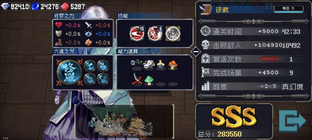 ✨模式:经典真幻境+混乱2 修罗:3000点(攻击、移速、暴击、攻速) 六道:修罗道 主副技能:佰刃+电疗 饮品:加金币饮料 魔法球:“特殊攻击”词条 一局通关大致奖励:约3000+石头 ✨运营思路:遇商店就3D,找“魂锁”,建议每张图跑完后优先购买高品质或有适配道具的武器,前期哪怕是一把白色武器,收益也大于一件道具。“魂锁”是银藏清怪的最核心道具,用了就知道香了。我的银藏是刮骨流,因此下面的道具