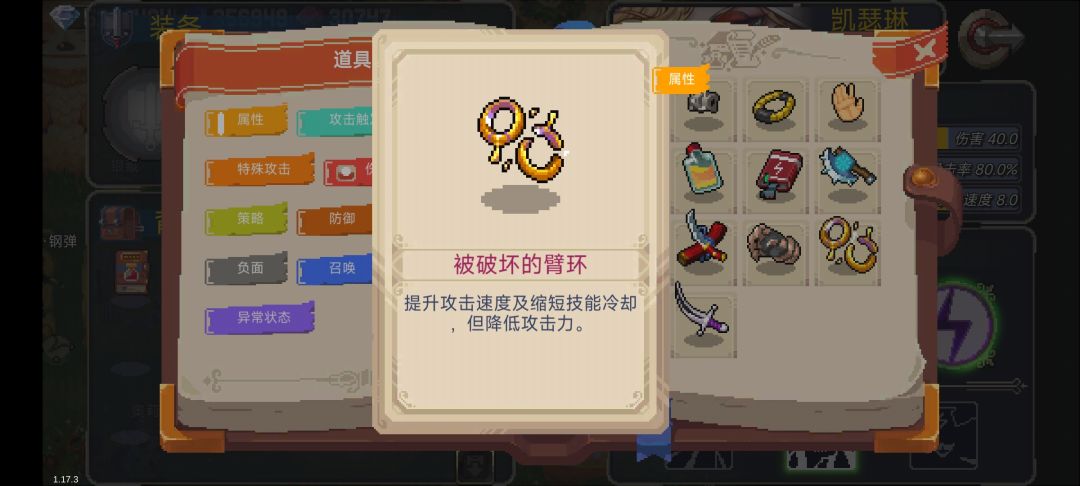 No.1 被破坏的臂环:(全游第一个倍乘攻速面板道具) 伤害总面板*0.7(固定伤害不受影响:如阴阳玉和摇杆) 攻速总面板*1.3(最早是*1.5) 25%冷却缩减 No.2 帝王引擎: 闪避一次提升10%基础攻速,最多50%基础攻速。 No.3 鬼武面具: 一次攻击提升5%基础攻速,最多30%基础攻速 No.4 图腾小妖: 踩上图腾立即提升20%基础攻速/移速 No.5(1) 伤痛应激核心: 掉
