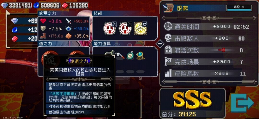 刷出词条为完美闪避引力波,完美闪避主技能固定5秒cd,完美闪避下一击伤害提高,完美闪避下一次攻击必定暴击,选定角色老板带1技能3风格有氧提升面板,主技能携带3技能3风格1000g一拳,道具ban掉负面里面除撬棍与单片眼镜以外所有道具,水晶球选择伤害,选定难度混7,修罗之力移速和伤害拉满攻速只要100左右即可,boss技能带魅音残响叠加易伤,喝爆伤酒,准备完毕进本以后闪避隐身直冲下一关房间对着房间角