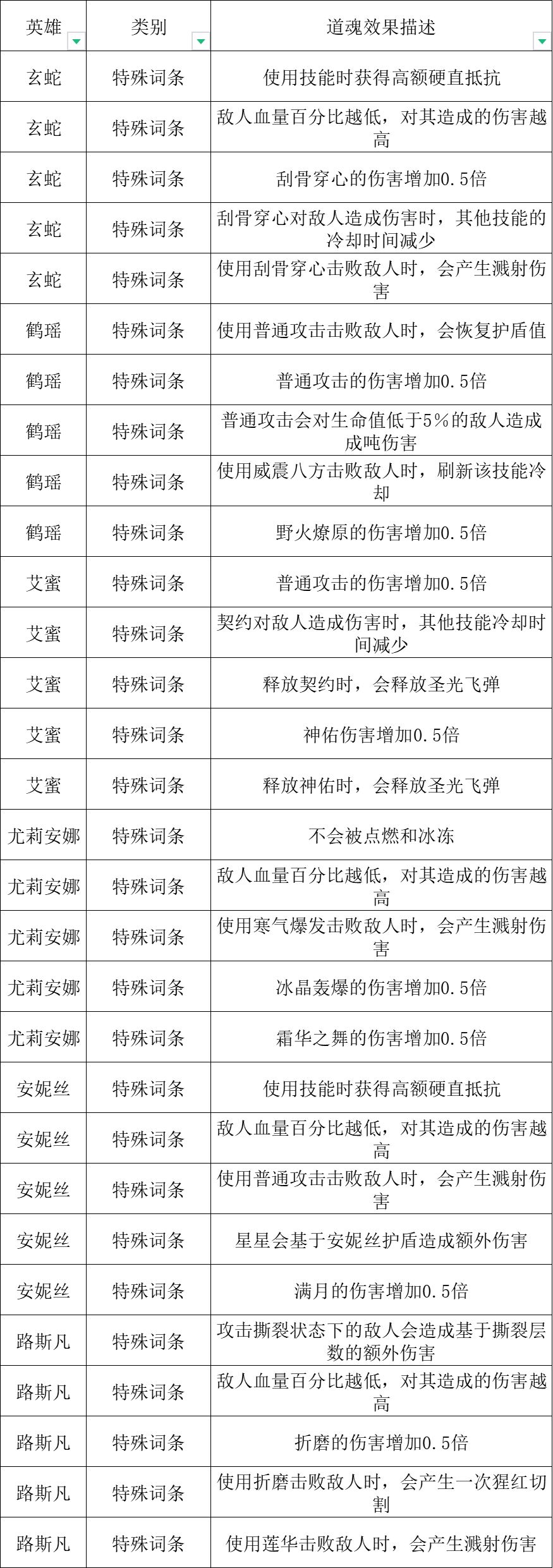按照官方说的每个英雄都有五个专属道魂,这两天一直在收集各英雄的专属道魂效果,目前为止收集到这些,留于此处,欢迎大伙进行补充,也希望能给大佬汇总全道魂时做个参考。