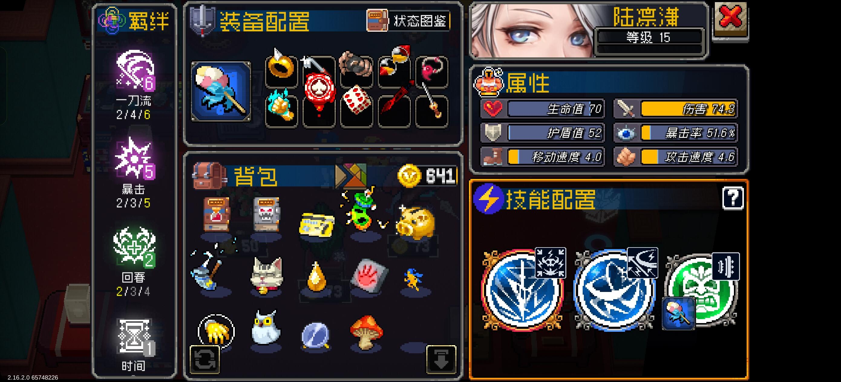 羁绊不错,但道具没做完一刀流暴击出伤快,之前银藏玩剑气,没准备一刀流的魂,现刷好像五六次就重铸出来了,运气不错吊炸天没了,可惜