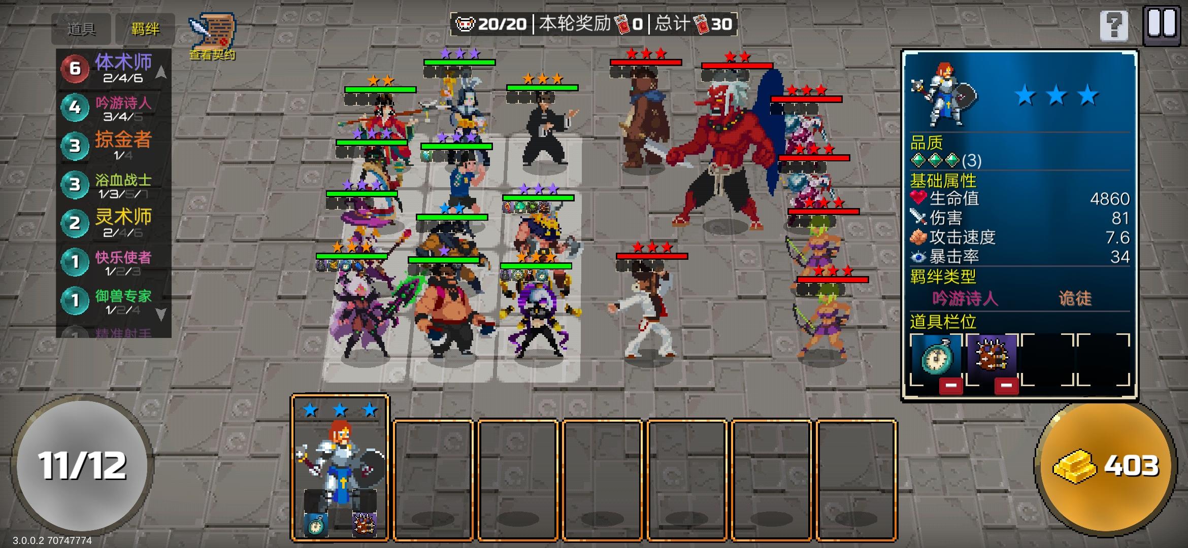 兄弟萌,如图所示,在本次自走棋版本中的唯一不需要依靠契约,甚至装备的万金油教程来咯你只需要激活体术师与游吟诗人羁绊,那么你就可以没有任何压力的通过20/20的最终关底唯一的关键点便是你需要主C希尔汀副C杰拉尔便可,当你拥有该两枚棋子以后,羁绊的最底需求是4体术4游吟诗人那么祝大家游戏愉快~
