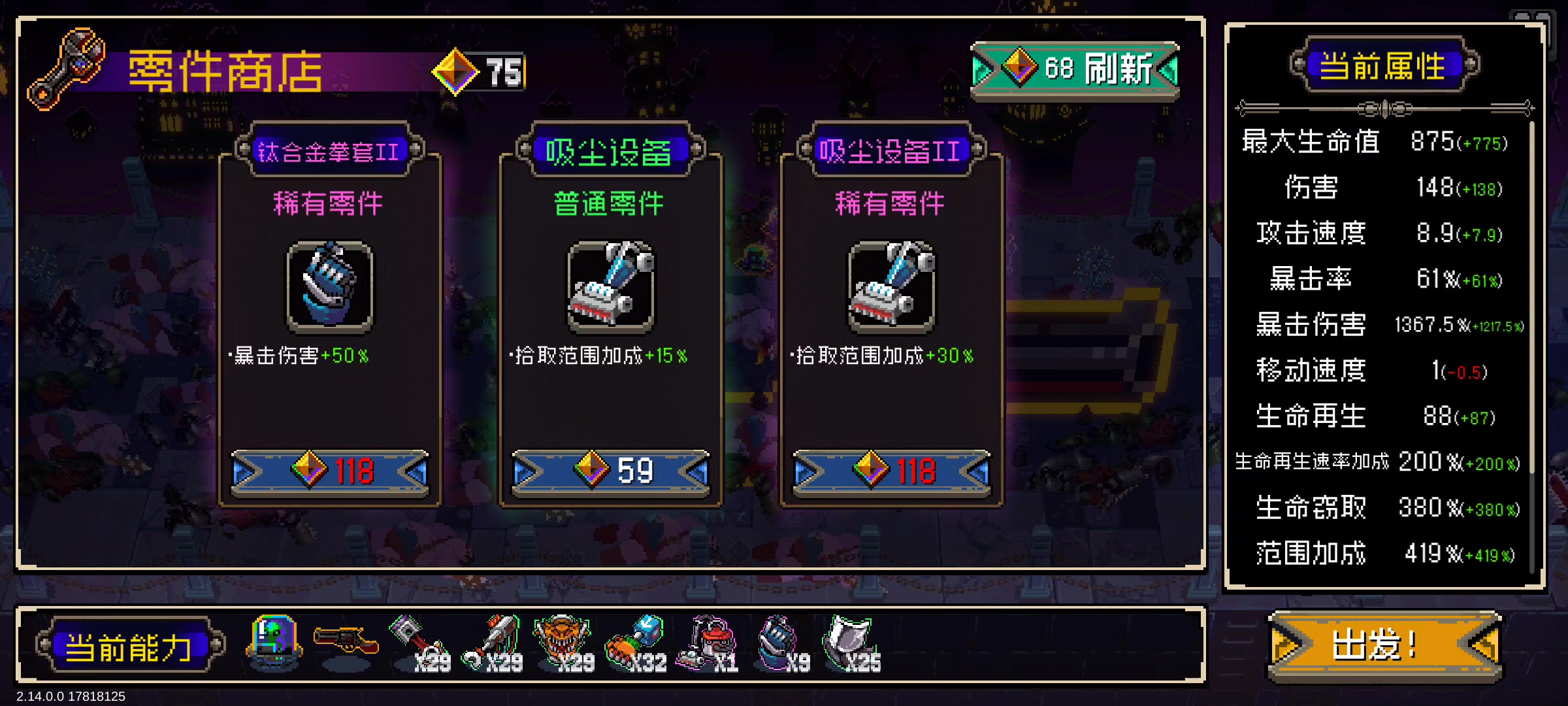 目前打到难度2,枪用着最强,前期伤害足、启动快,点出核心的连发枪I、II、III,商店买攻速、伤害、暴击、爆伤,和资源类,恢复推荐吸血,后续就滚雪球直接秒天秒地。最后BOSS都没见着面就无了。 剑、锤、喷火器难度2惨败第二个小BOSS,都不知道怎么发育。 顺带人物方面我觉得记录仪很好用,有资源收集加成前期能迅速发力,最高等级20后期也牛逼 #战魂铭人新模式