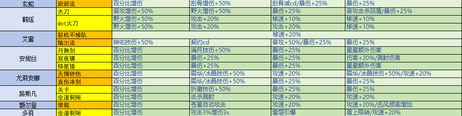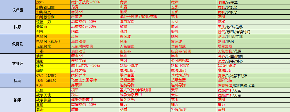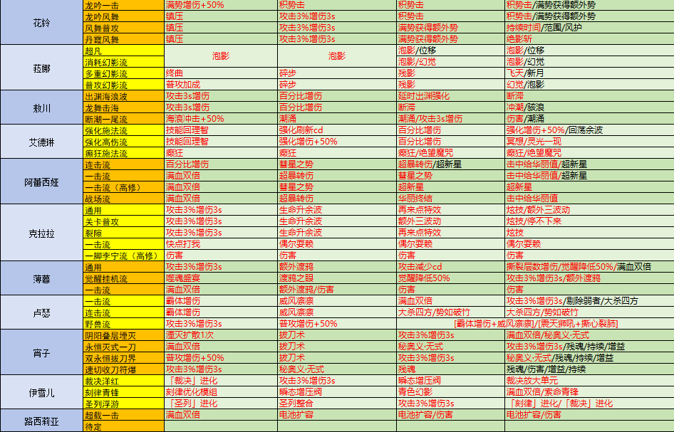 『伊雪儿』¤普通攻击伤害增加50%¤对满血敌人造成2倍伤害¤每次攻击提升3%伤害持续3秒¤刻律进化(风格一)攻速不锁定,可获得50%攻速加成¤裁决进化(风格二)神裁持续时间缩短70%,总伤不变¤圣列进化(风格三)浮游炮子弹数量翻倍『路西莉亚』¤普通攻击伤害增加50%¤对满血敌人造成2倍伤害¤普攻对5%血量以下的敌人造成成吨伤害¤狙击击杀敌人,所有技能冷却缩短1秒¤每次狙击命