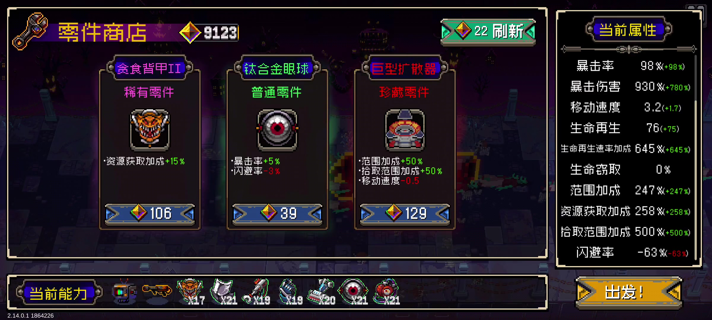 玩到后期范围拿的太多了反而有点卡手,如果范围拿多了可以多拿点拾取范围,一样能捡,站原地就行,之前搭配过南瓜头,但最爽的还是这个👆🏻👆🏻👆🏻👆🏻