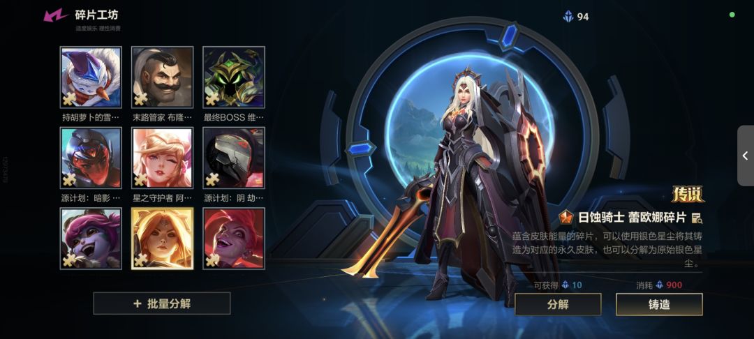 目前有的皮肤碎片都搁这儿了~一直也没想好有什么可以合成的。😳