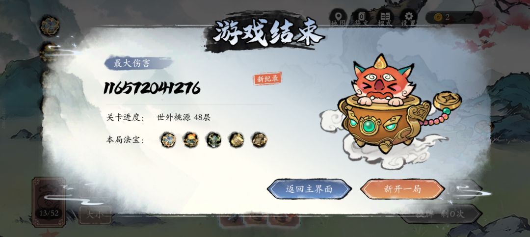 ☜看了论坛里面仅有的几个神机妙算帖子,才终于知道伤害倍率的重要性。既有凑巧,也有刻意,还有运气,我巅峰时期的伤害倍率达到1780%+1780%+980%+500%+250%*3=5790%。 ☜法宝真的很重要,商店一开张就要立即买法宝。如果运气好就能买到可以不断永久增成的法宝,实在不行就要挑选那些容易触发的法宝(法宝有触发条件)或者能让你更容易达成出招的法宝(诸如两个元素视同一个元素)。如果商店实